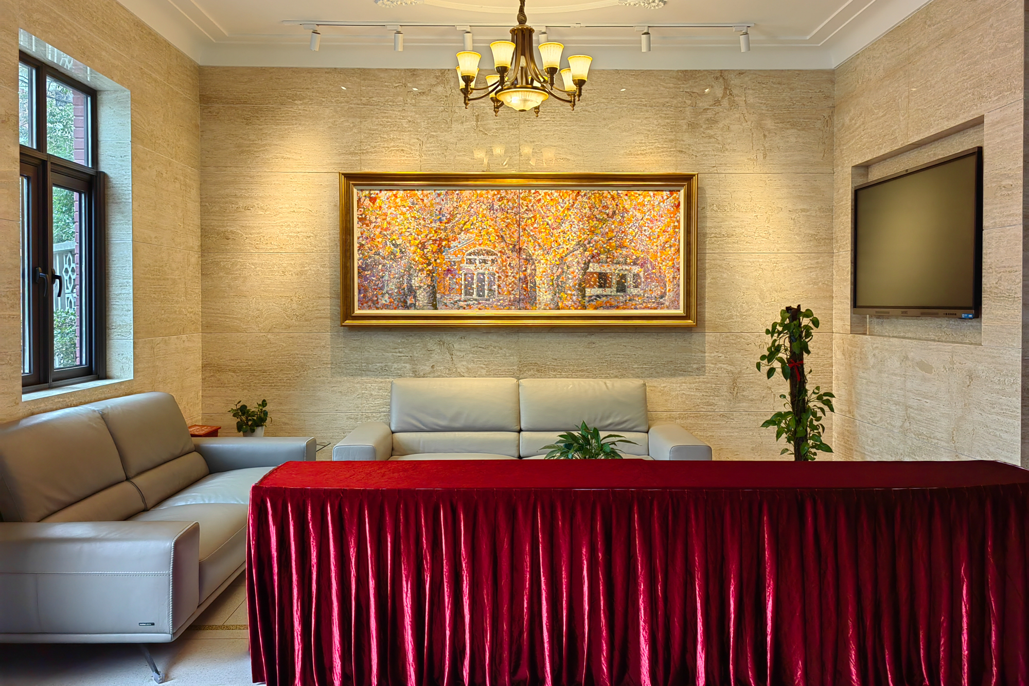 马俊营简要介绍了油画的创作思路。这幅油画长2.6米、宽1.1米,从选题、构思到创作历时近半年之久。作品以两联画的形式,以师大“思群堂”和普陀校区的工会小楼两个建筑为主体,通过位置安排凸显了学校与工会的关系,寓意着有“校”才有“家”。整幅油画以温暖的橙色为主色调,非常契合校工会的“气质”,不仅代表着工会给人“家”的温暖,也彰显了工会人的开朗与热情。同时,画面深层的紫色基调表现出了华东师大这座学府的优雅与浪漫。整幅画面有七棵具有华东师大校园特色的梧桐树,代表着校工会在发展历程中走过的七秩风雨,树木以“人字形”形象代表华东师大工会“顶天立地”的工作定位,七棵树从左往右“三、三、一”的构图创意源于《道德经》中“道生一,一生二,二生三,三生万物”,寓意着工会今后发展长长久久、欣欣向荣。