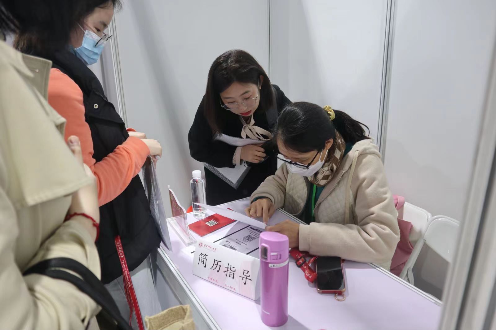 招聘会在入口处开设了政策咨询和简历指导展位,邀请资深专家来为同学现场答疑解惑,提供就业政策、简历和面试的指导与咨询。面对前来咨询的毕业生,老师们根据学生的情况和应聘岗位,对简历提出针对性的指导建议,同时帮助毕业生了解最新政策、就业形势,提高求职技巧。