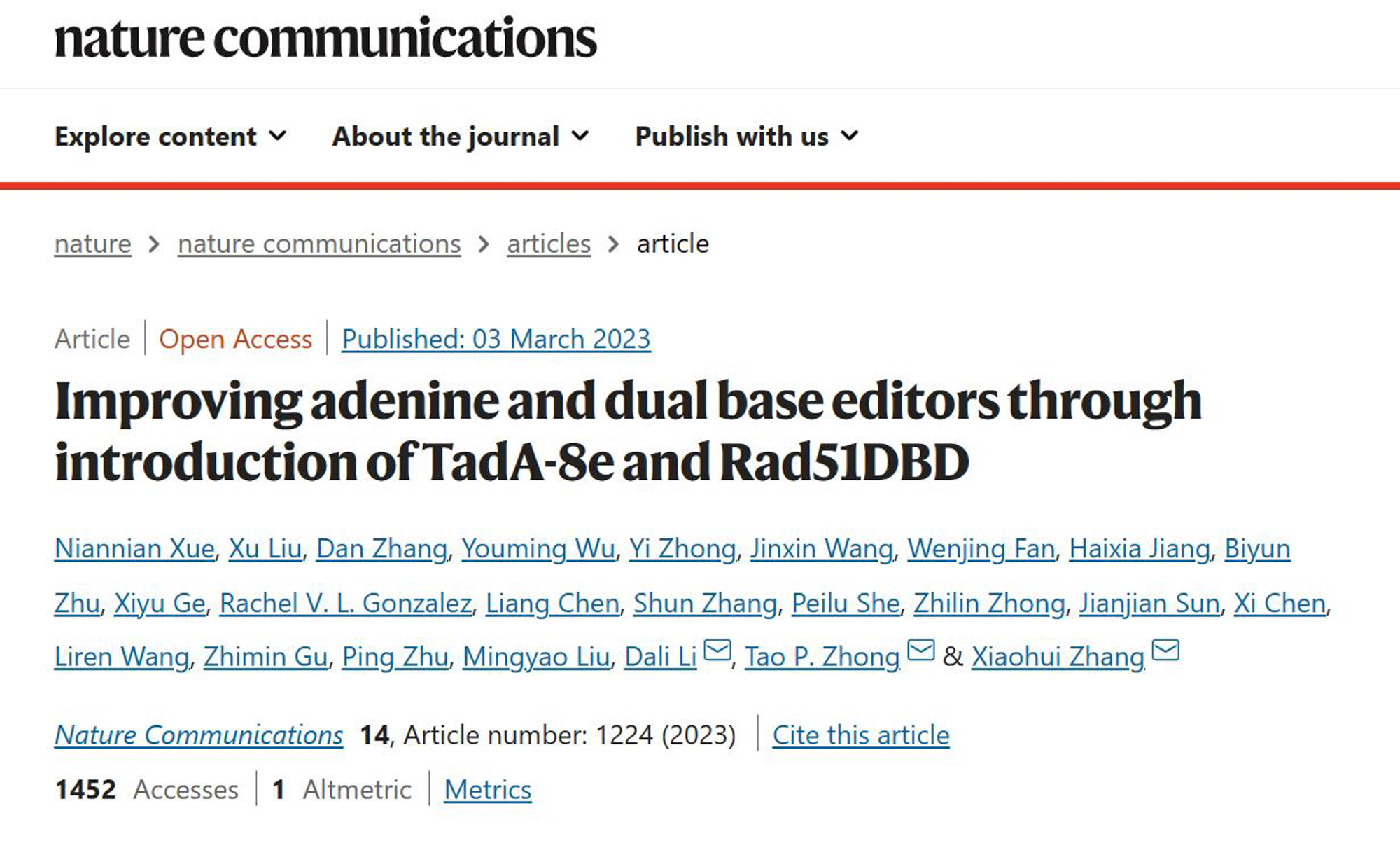 2023年3月3日,3245澳门新莆京生命科学学院/上海市基因编辑与细胞治疗前沿科学基地张晓辉(现为中国医学科学院苏州系统医学研究所PI)、钟涛和李大力,在《自然通讯》(Nature Communications)杂志上发表了题为“Improving adenine and dual base editors through introduction of TadA-8e and Rad51DBD”的论文。开发了具有超高活性的腺嘌呤单碱基编辑器 (hyABE),极大地提高了靠近PAM区A-to-G的转换效率,扩大了编辑窗口。同时,作者研发了超高活性的嘌呤嘧啶双碱基编辑器(eA&C-BEs和hyA&C-BEs),大幅提高A-to-G和C-to-T(A/C)同时编辑效率,并首次证明在斑马鱼胚胎中具有A/C同时编辑功能,展现了新型腺嘌呤碱基编辑器hyABE在构建点突变疾病模型中的优势。