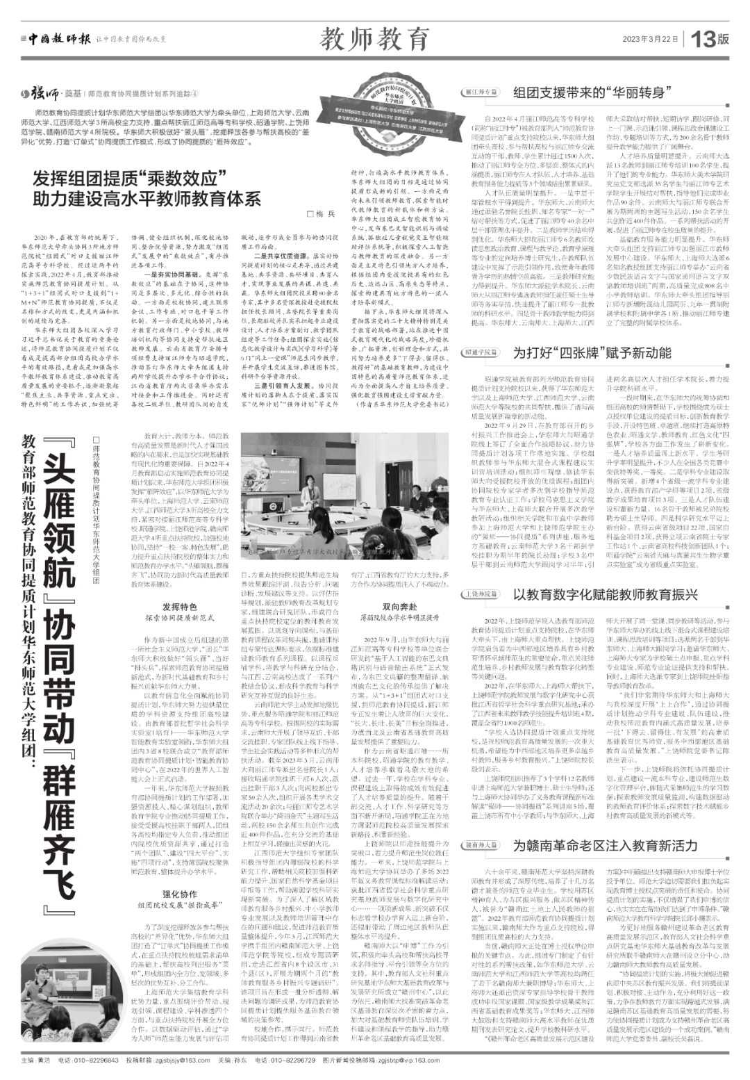 “头雁领航”协同带动“群雁齐飞”,3月22日,《中国教师报》整版报道了华东师大牵头教育部协同提质计划第二组团情况