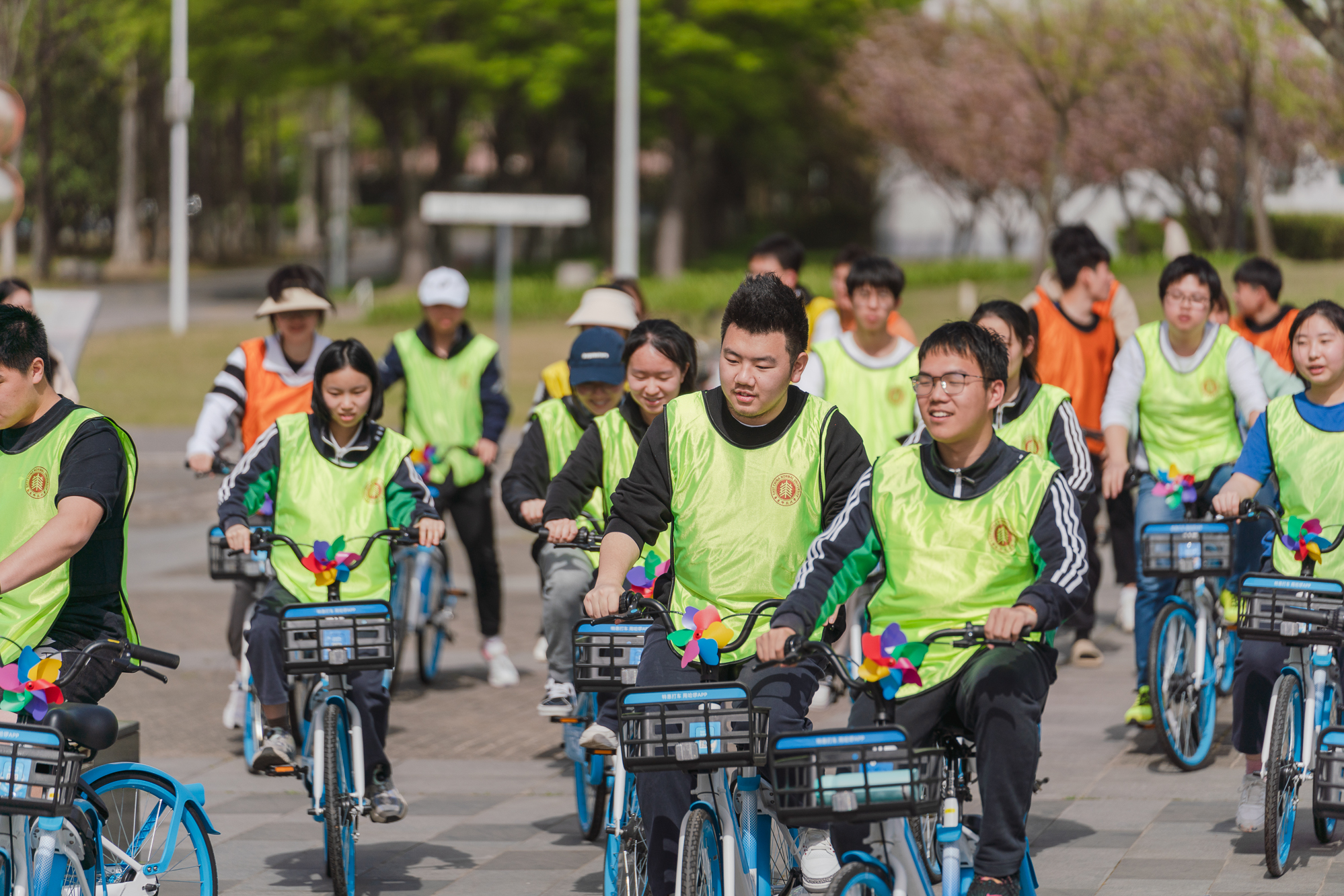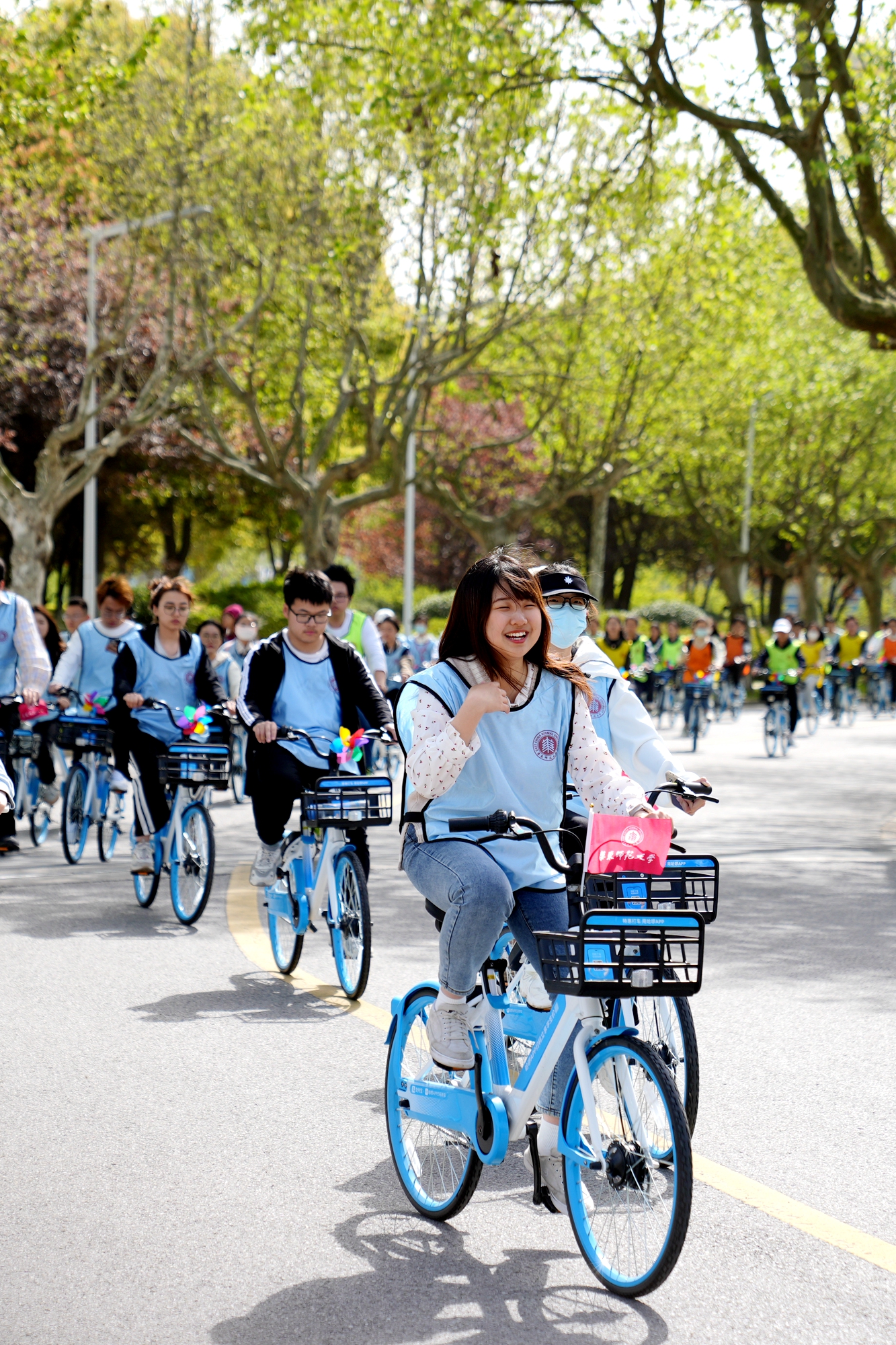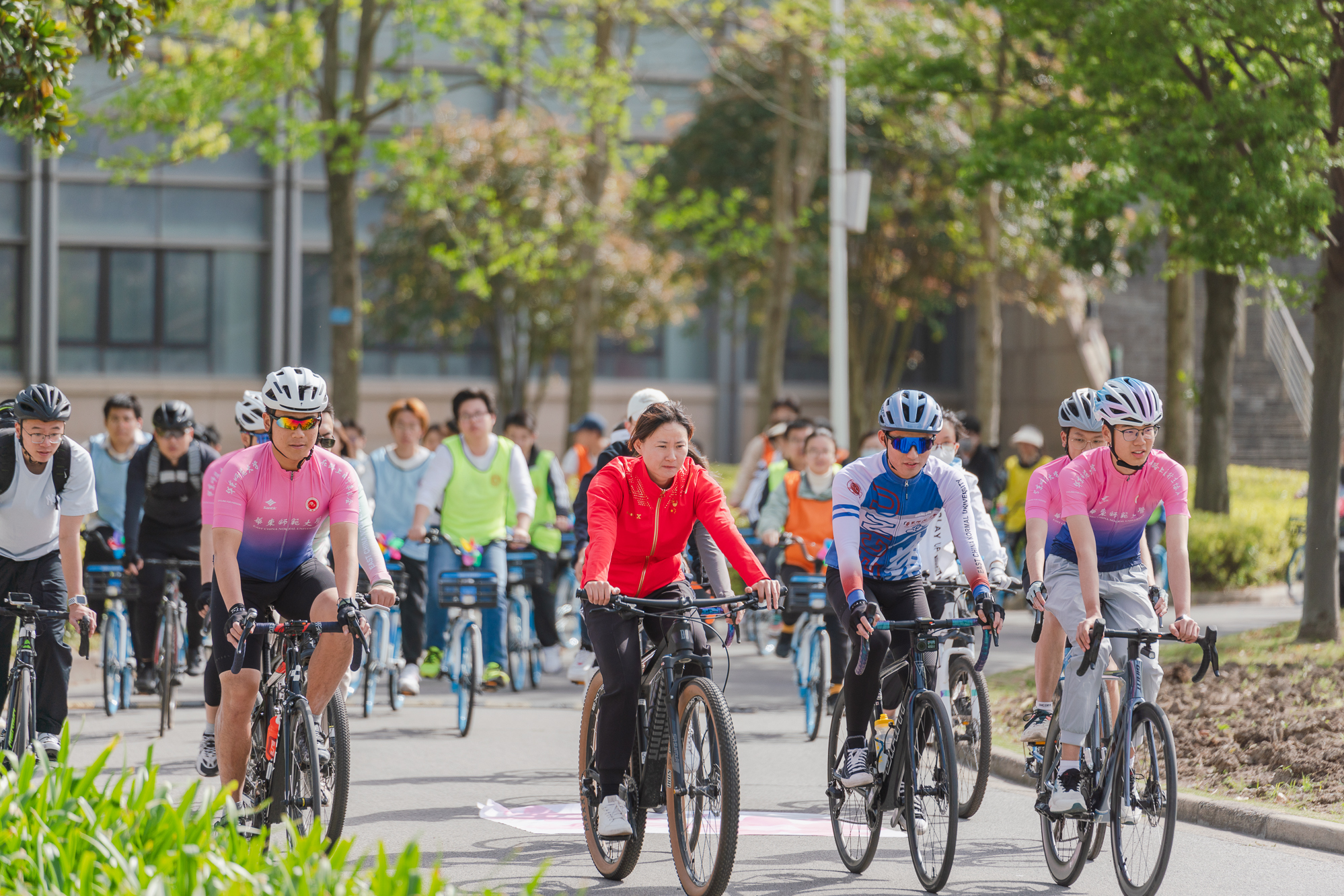 发令枪响后,钟天使带领骑行团从图书馆出发,沿着“文脉廊—樱桃河”环骑校园,奥运红、单车蓝与师大青年的青春身影共同构成了春日校园中最生动的一抹亮色。