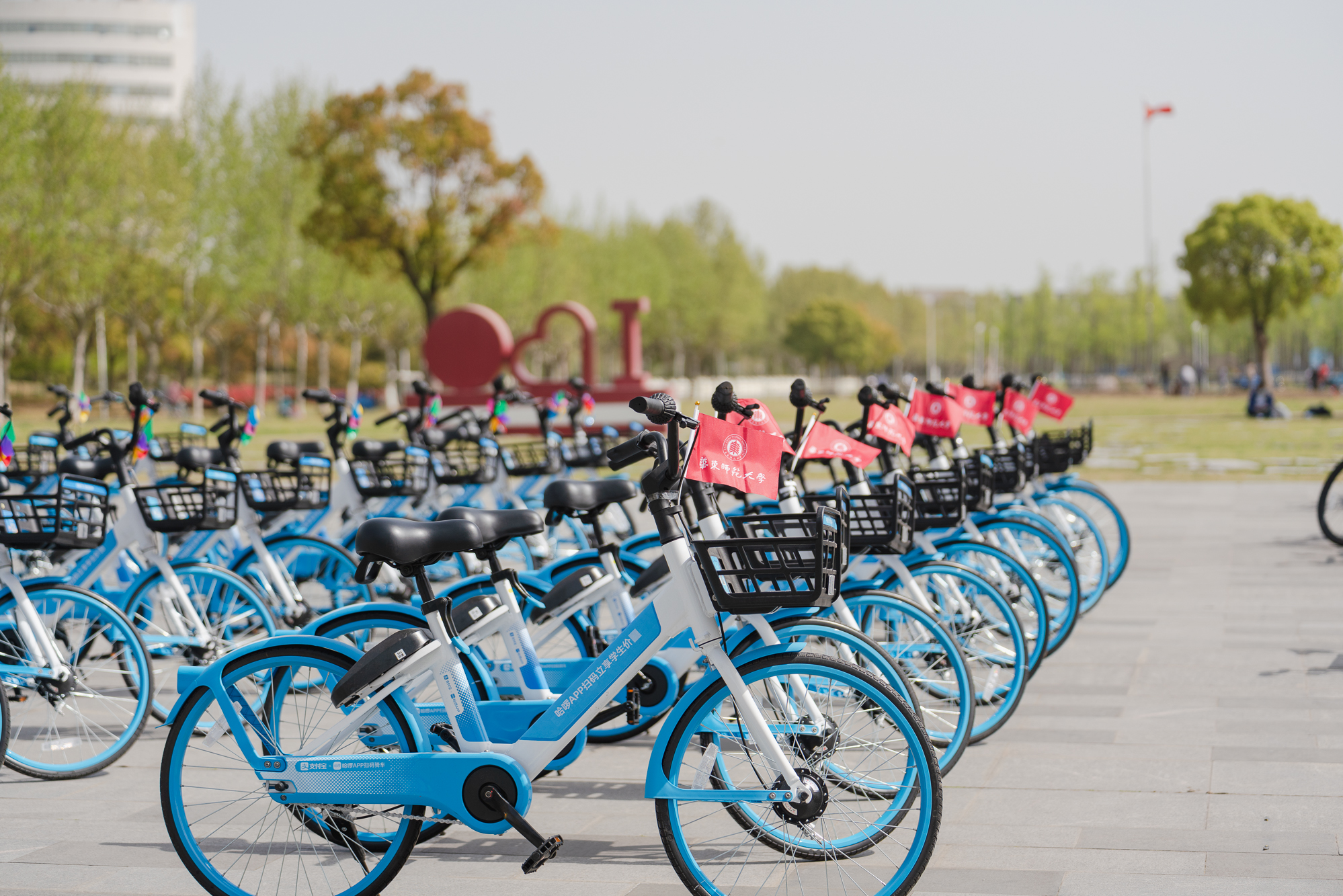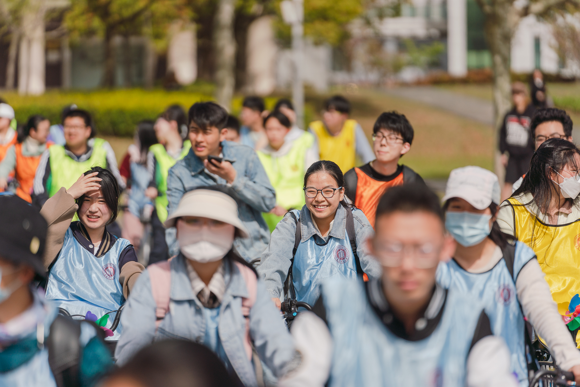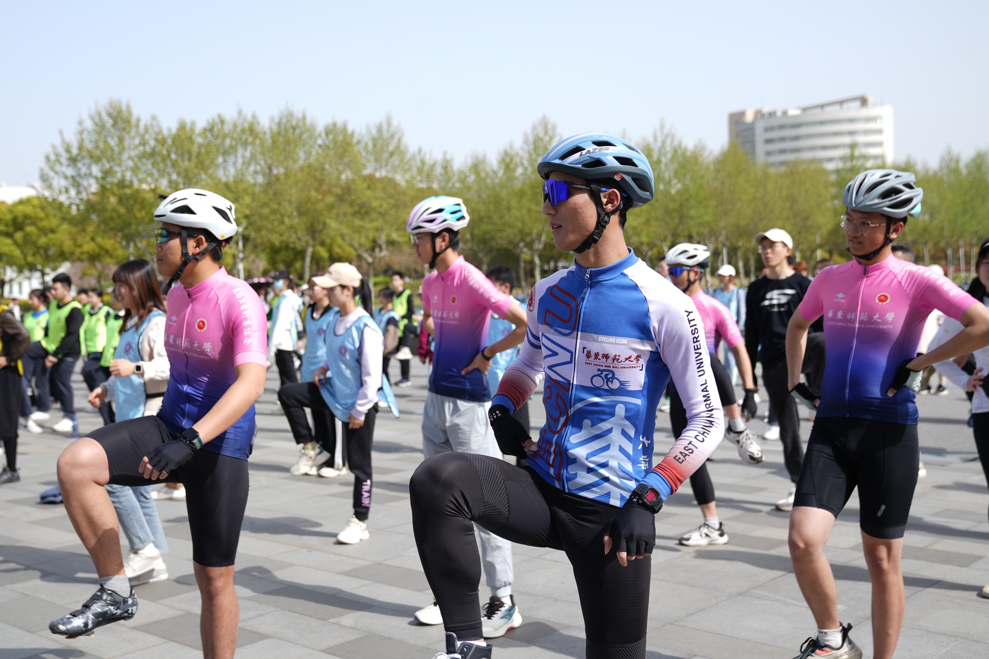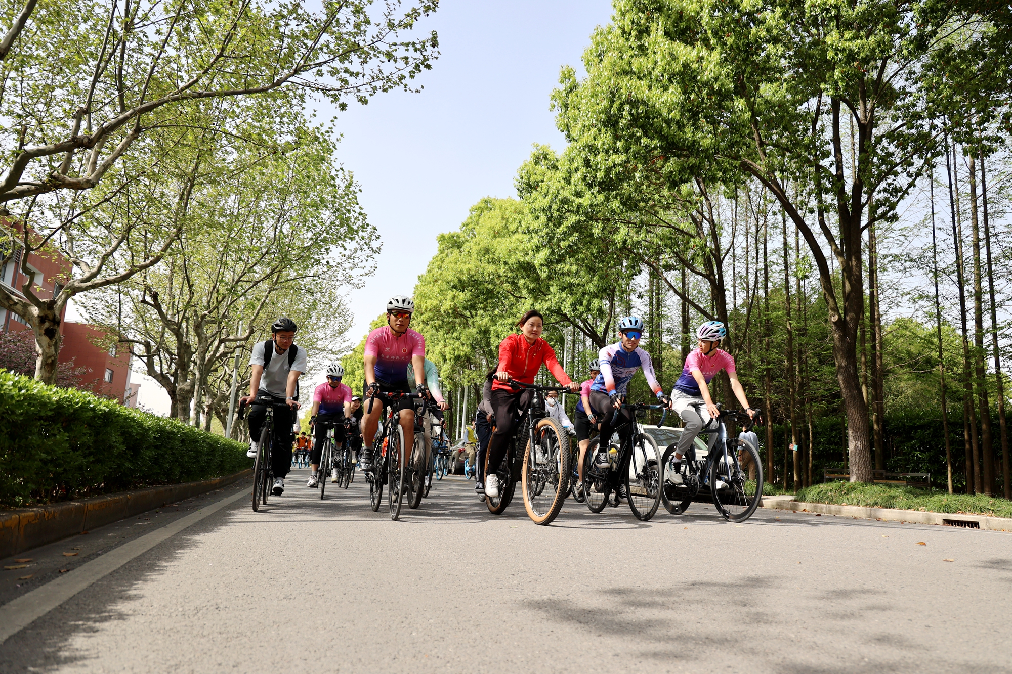 发令枪响后,钟天使带领骑行团从图书馆出发,沿着“文脉廊—樱桃河”环骑校园,奥运红、单车蓝与师大青年的青春身影共同构成了春日校园中最生动的一抹亮色。