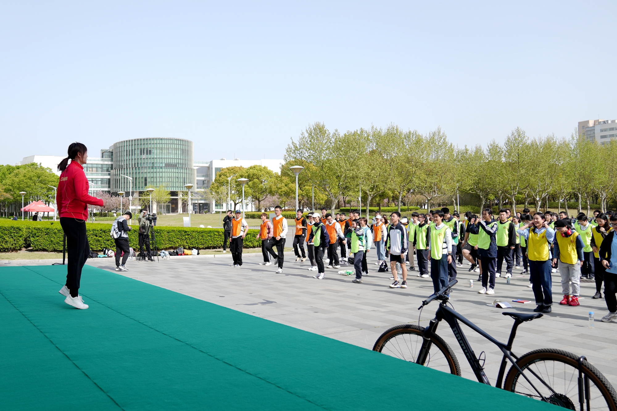 骑行前,钟天使带领同学们热身
