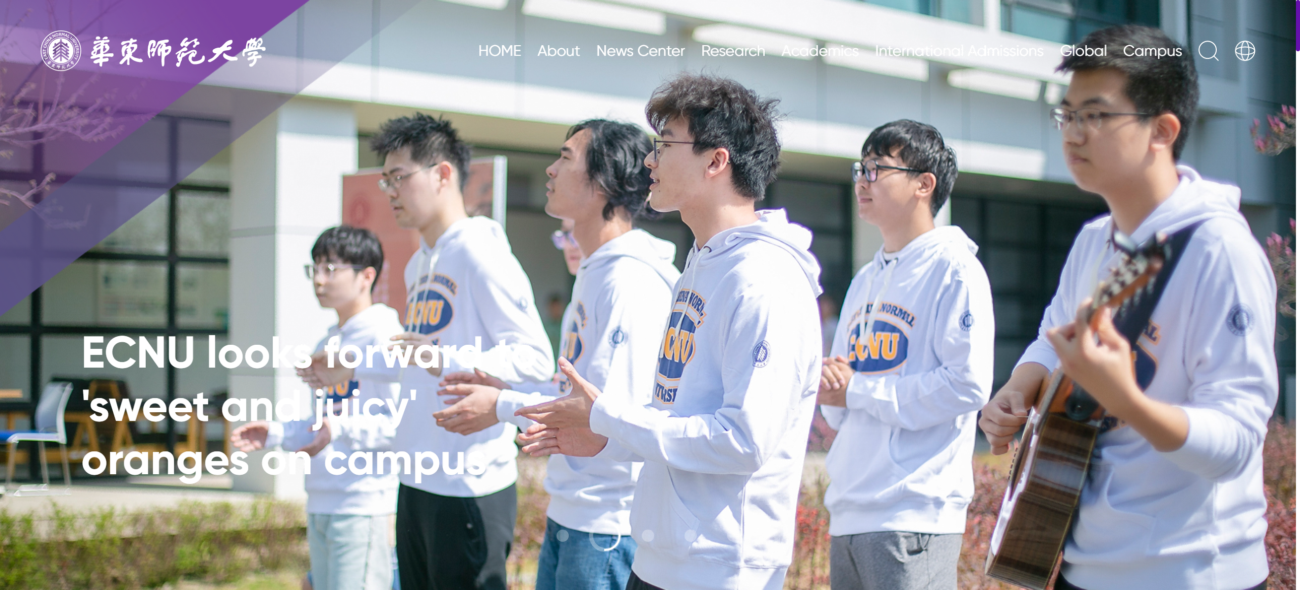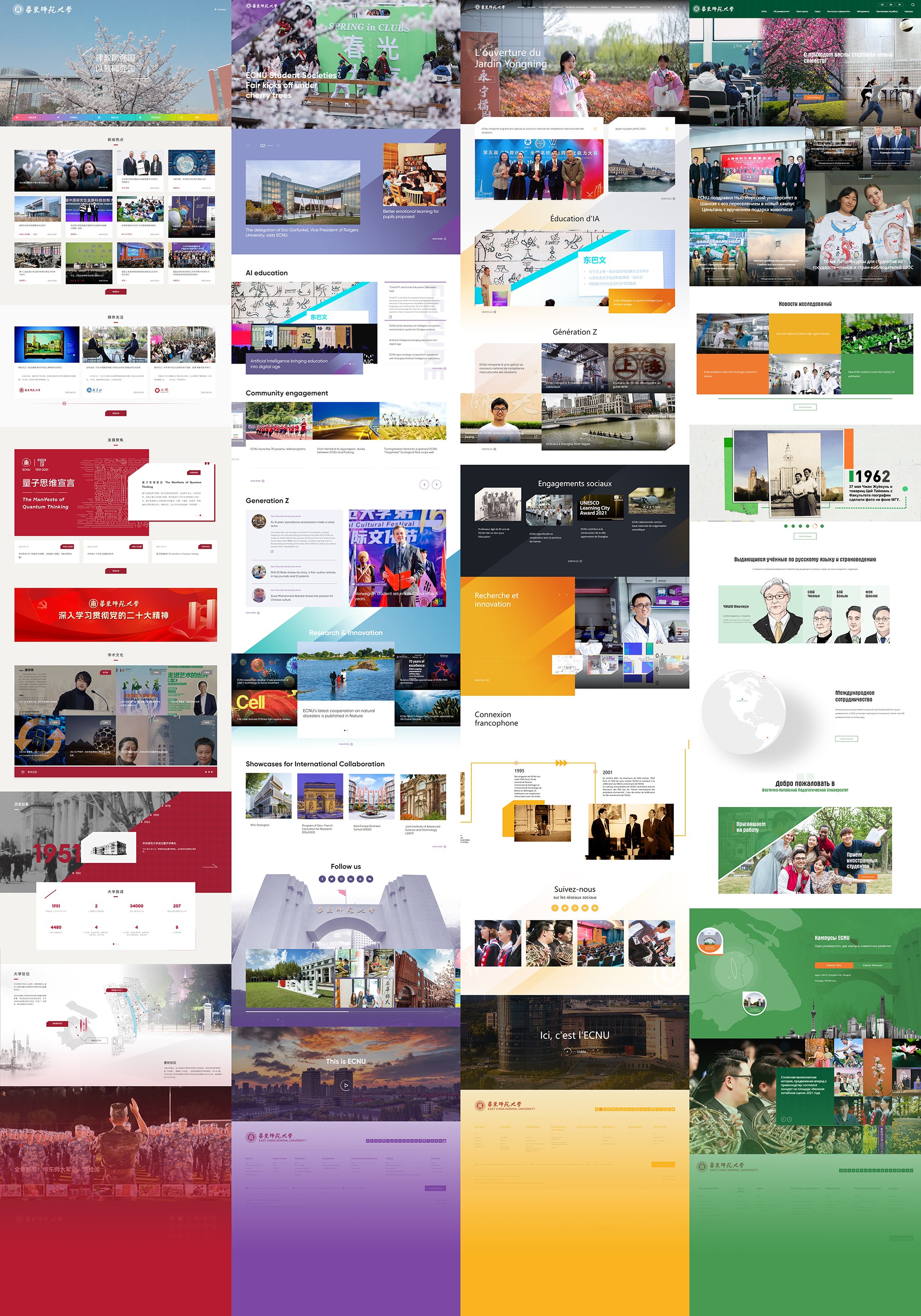 华东师大三个外文网站的主色调选择都很有深意,和中文主页形成“红紫黄绿”(中、英、法、俄)的多语种网站品牌体系。俄文官网以绿色系为主、橙黄为辅的色调,主色调灵感来源于俄罗斯建筑;英文官网以沉静有力的紫色为主色调,是对华东师大与纽约大学合作创立上海纽约大学典范意义的回应。