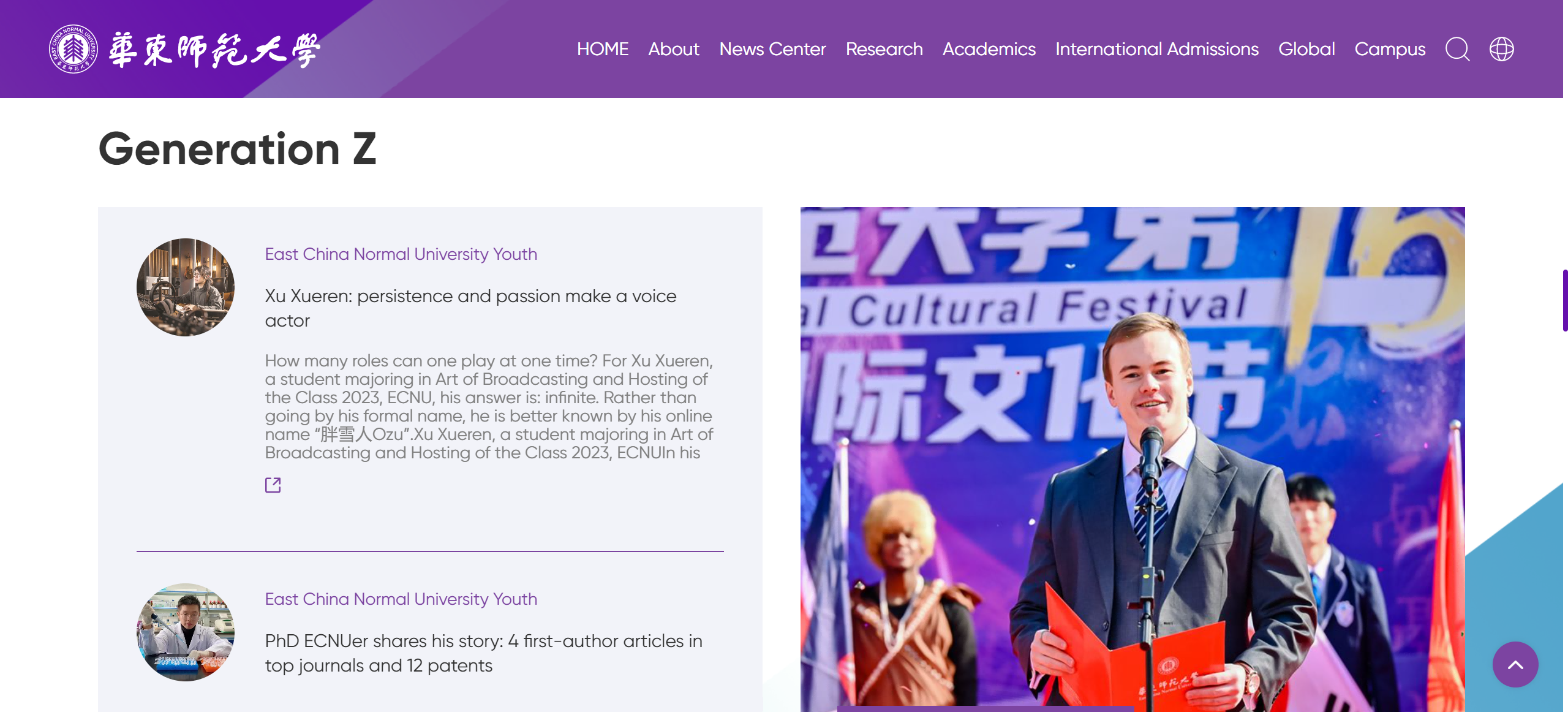 值得一提的是,网站主页在栏目设计上特别着力新闻专题内容建设,展示学校重点工作方向和社会服务成就,聚焦智能教育前沿,关注教育赋能乡村振兴建设成果,展示华东师大“Z世代”青年风采,通过全面立体的内容输出,讲好中国大学故事。