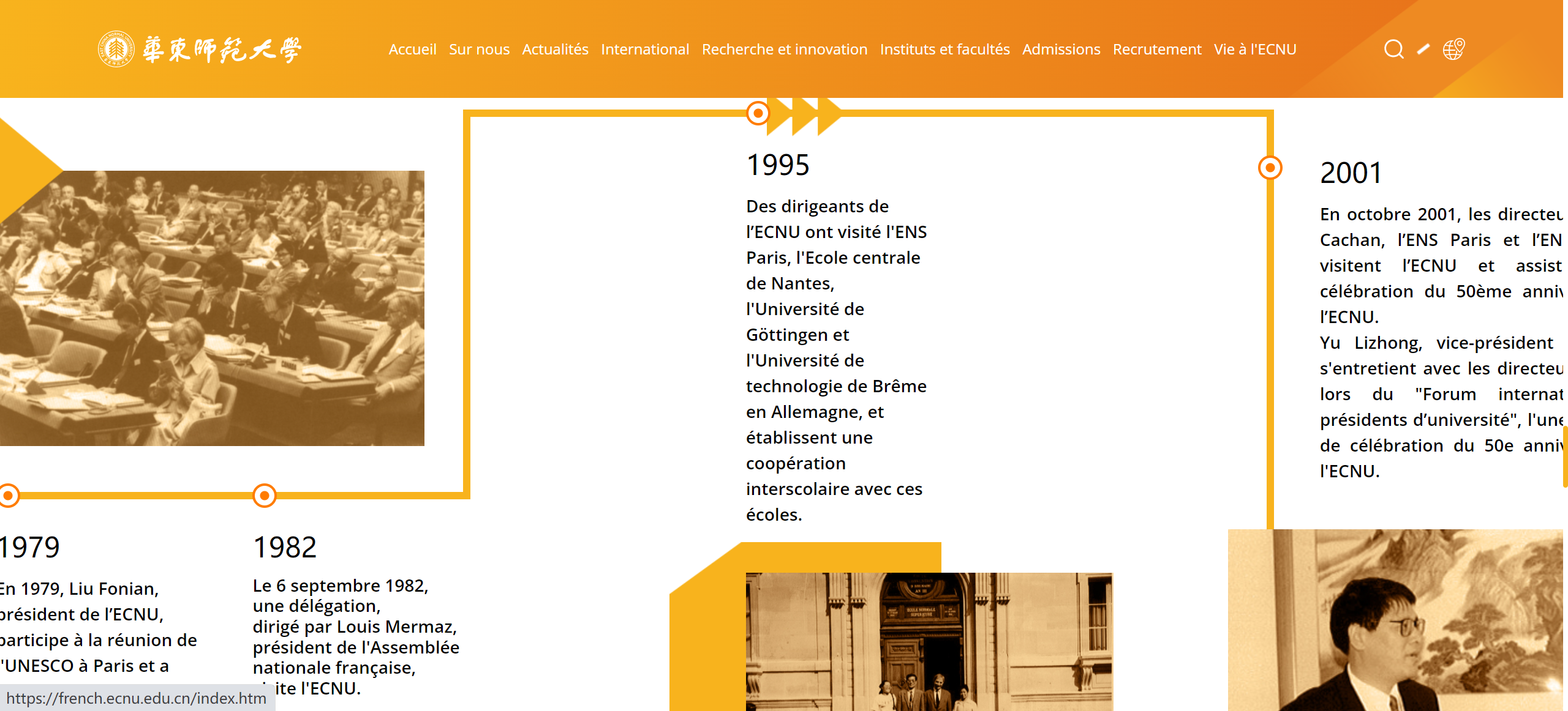 新版法文网站在首页特设了“中法合作”板块,以时间轴形式,展示多个珍贵历史影像,全景回顾华东师大与法国高校自上世纪70年代以来的合作友谊,重点介绍了学校中法联合培养项目(PROSFER)签约、亚欧商学院成立等重要历史时刻。时代精神与历史传统交相辉映,为使用者带来更为饱满的浏览体验。