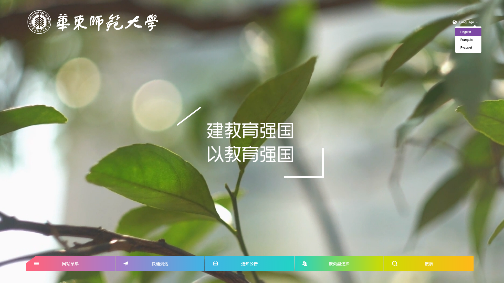 华东师大新版英文、法文网站可通过中文主页右上角的语言菜单点击进入
