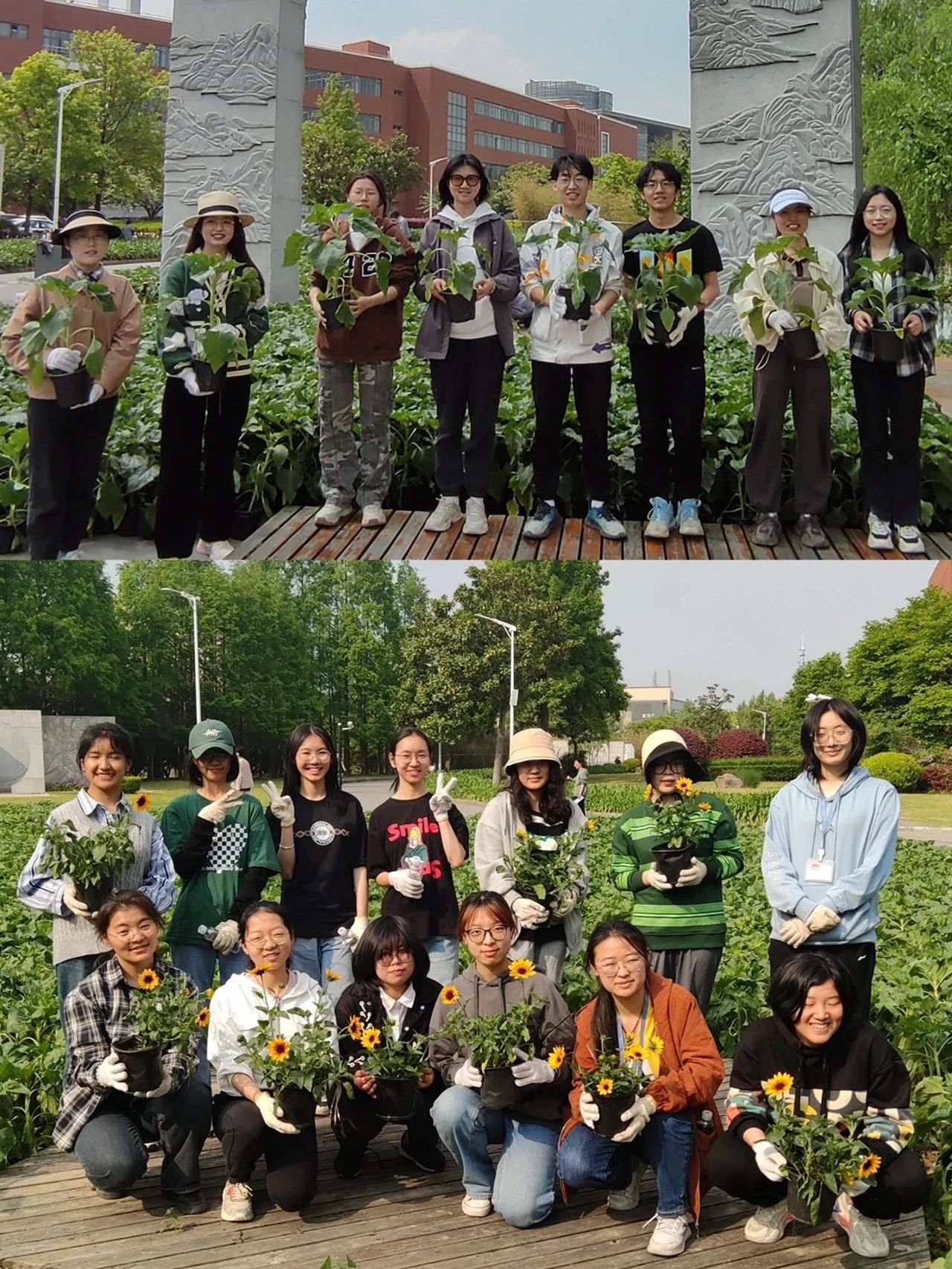 一同参加种植的还有校团委招募的志愿者同学们,脚踩泥土,心向阳光,他们是不是笑得和向日葵一样美?