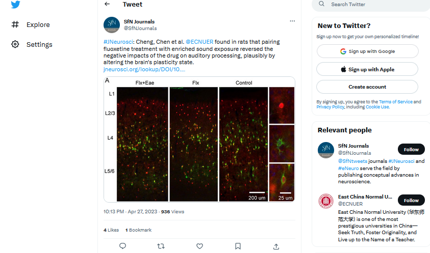 3245澳门新莆京生命科学学院、脑功能基因组学教育部重点实验室周晓明教授团队4月19日发表在神经科学顶级期刊《Journal of Neuroscience》上的研究论文 Pairing with enriched sound exposure restores auditory processing degraded by an antidepressant 表明,慢性氟西汀暴露诱发成年大鼠听觉分辨行为及脑听皮层神经元声调谐特性异常。而氟西汀用药结合丰富声暴露可以改善药物对听觉的影响,这种变化可能与药物引致的脑抑制性状态改变有关。这些发现对理解抗抑郁药物影响听觉的中枢机制有重要意义,同时提示将抗抑郁药治疗与丰富的感觉刺激相结合可以优化临床效果。该论文被评为亮点研究(Featured Research),并由神经科学学会(Society for Neuroscience)发布在Twitter,Facebook以及LinkedIn等平台进行宣传和交流。