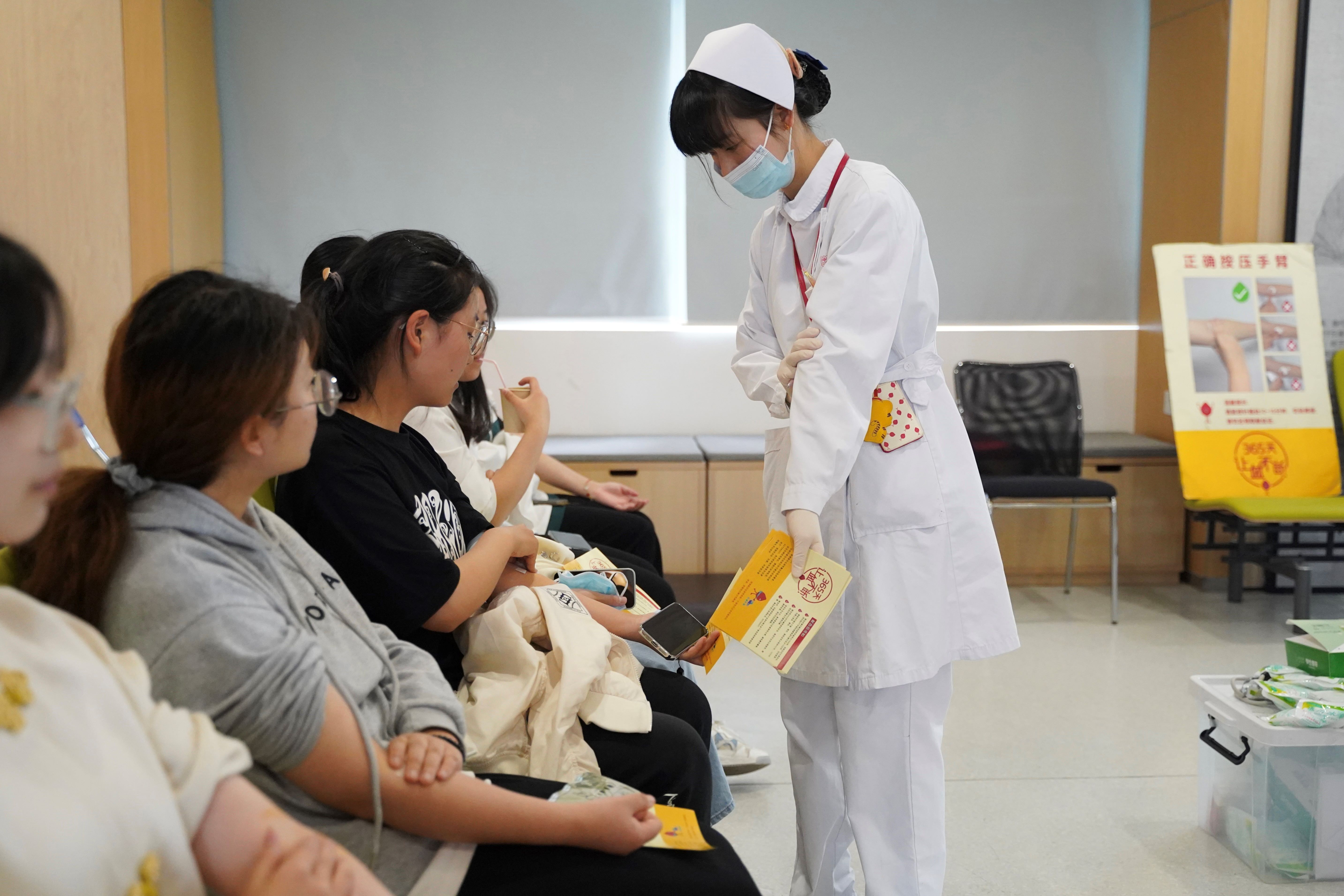 医务人员和志愿者叮嘱和安抚献血人员