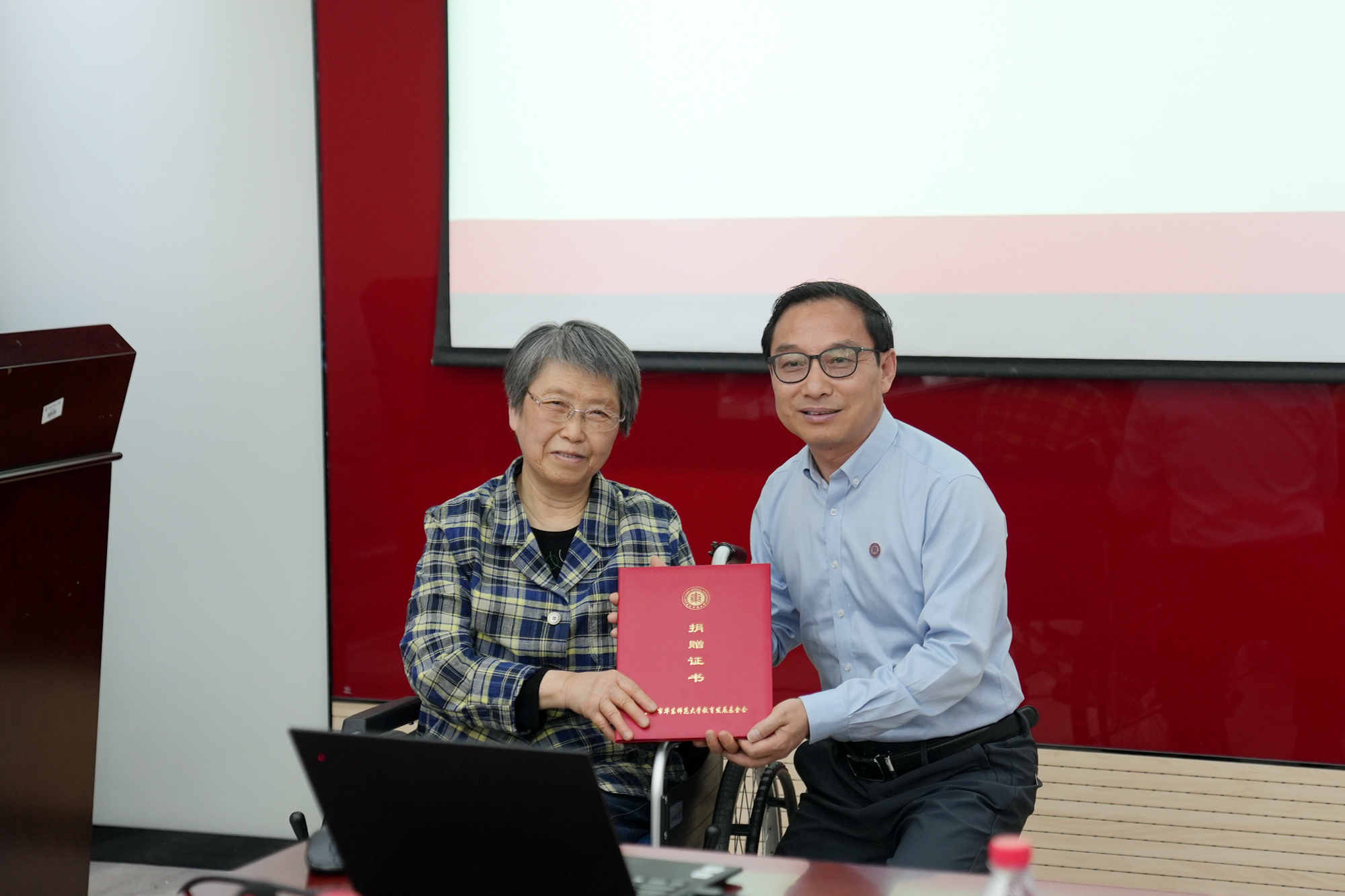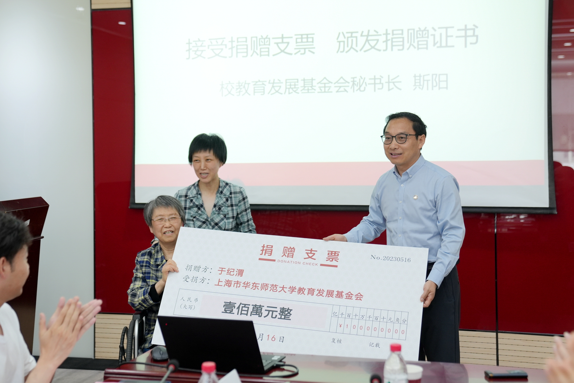 随后,校教育发展基金会秘书长斯阳接受捐赠支票,并向于纪渭先生亲属颁发捐赠证书。