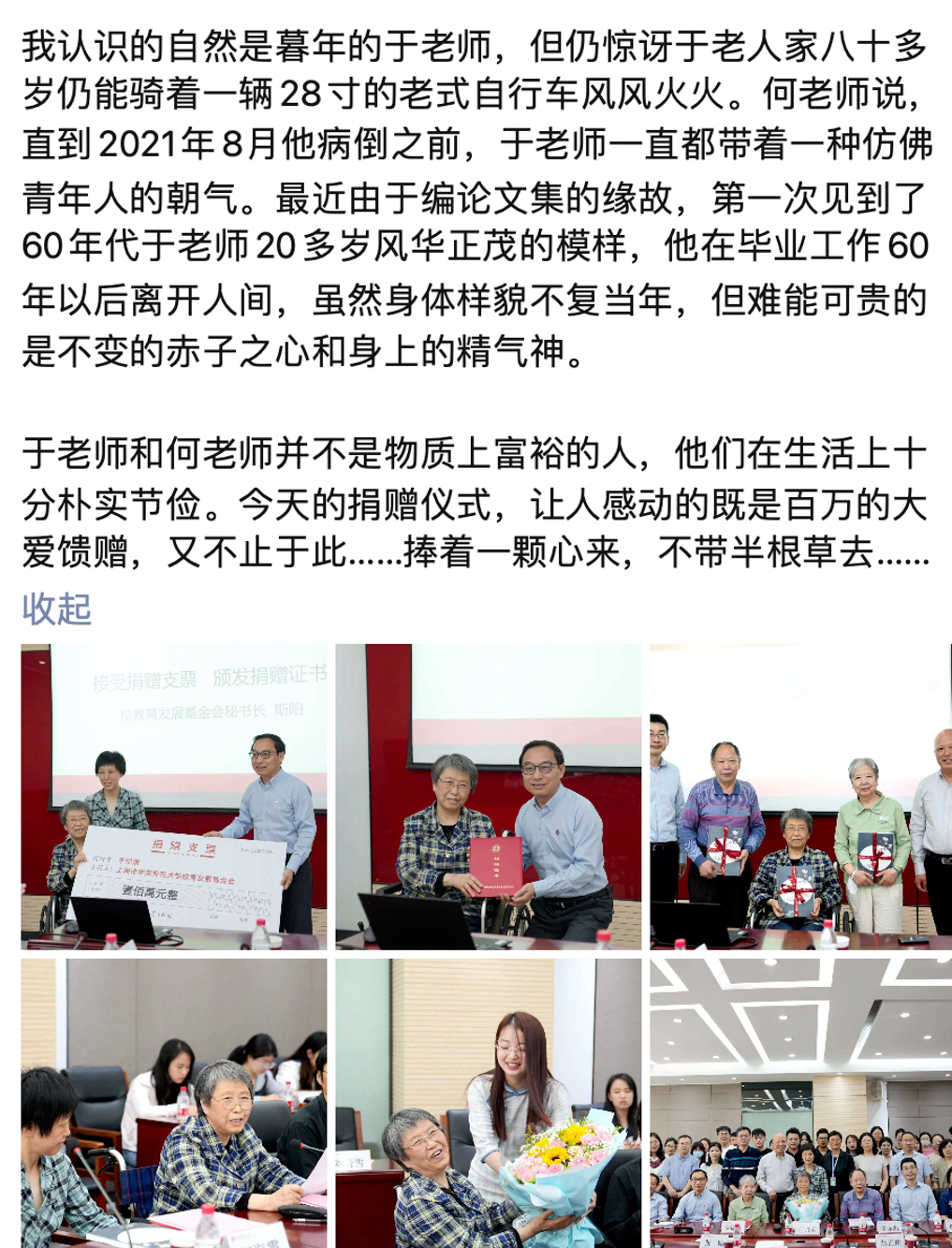 2021年9月19日,华东师大老教授于纪渭在弥留之际立下遗嘱将100万元积蓄捐赠学校。2023年5月16日上午,于纪渭先生的遗孀、华东师大64级数学系校友何月英女士携女儿何海霞来到闵行校区,实现于纪渭先生的这一临终心愿。