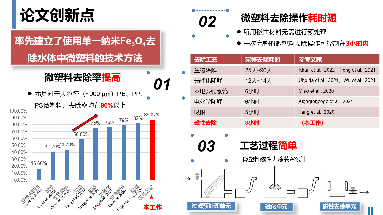 由生态与环境工程学院何德富老师指导,2018级环境科学专业史夏虹完成的论文率先建立起了一种使用单一磁性纳米Fe3O4去除水体中微塑料的技术方法。