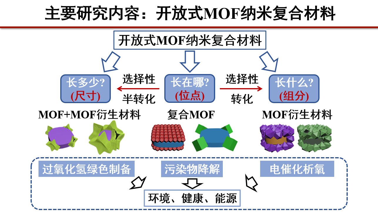 具体表现为:(1)开发位点选择性生长策略,制备开放式MOF-on-MOF异质结构,利用多组分协同,增效降解有机污染物;(2)可控构建MOF基异质结,提升光催化制备过氧化氢性能并阐明异质结覆盖率对光催化性能的影响机制;(3)设计MOF衍生双金属硫化物中空超结构,增强电催化析氧活性。