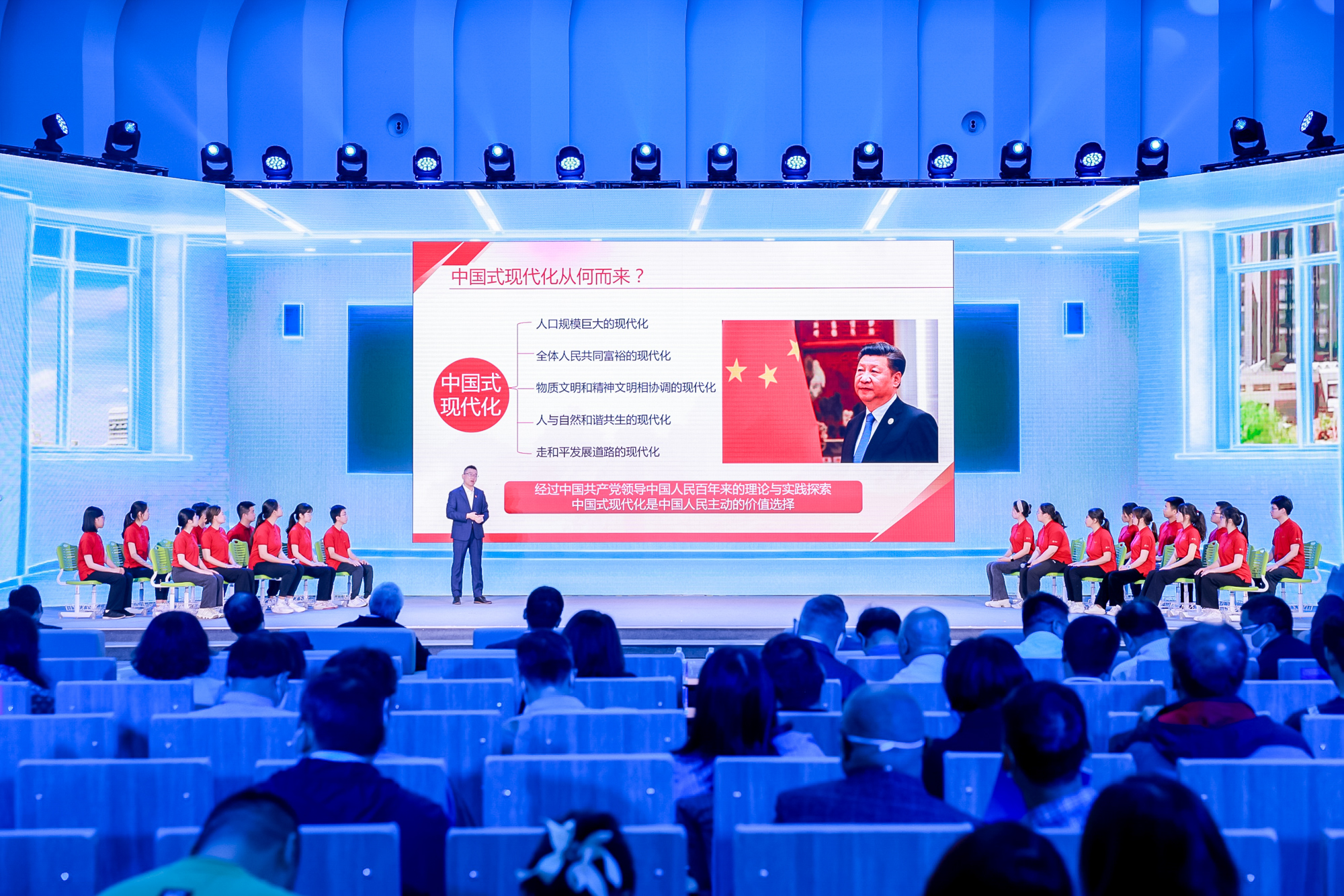 上海市委常委、临港新片区党工委书记、管委会主任陈金山,3245澳门新莆京党委书记梅兵,上海海洋大学党委副书记、校长万荣等相关上海市与高校领导、专家、学者、“大思政课”教师代表,以及大中小学师生200余人现场观摩此次活动。本次活动还通过央视频、微信视频号等网络平台同步直播,吸引了全国各地马克思主义学院师生及大中小学思政课教师代表等在内的近4万人在线共同观摩学习。