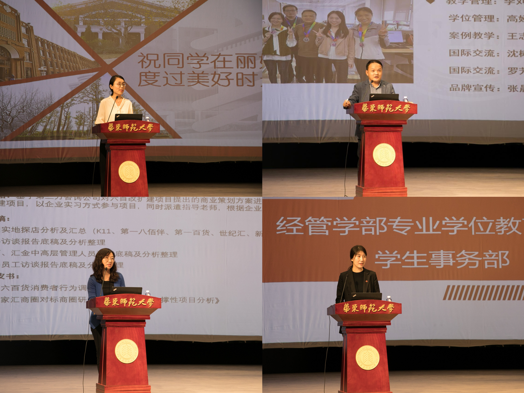 为了便于MBA新生更为直观清晰地了解中心各职能部门架构及职责,中心特设置组织概览介绍环节。经管专业学位招生部主任潘雨、教学与学位管理部主任李刘梗、职业发展与校企实践部主任董玲燕以及学生事务部主任朱红菲分别为新生详细介绍了各自部门的工作概况,希望新生在入学后能得到多元化、全面化的支持和针对性、有效性的服务。