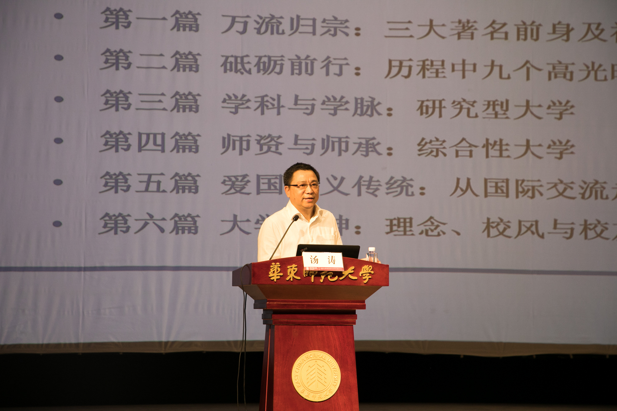 最后,通过介绍学科与学脉、师资与师承两个方面的内容,汤涛表达了对新生们的期盼:希望大家能够深入了解华东师大的校园思想与文化,传承华师精神,做好华师人。