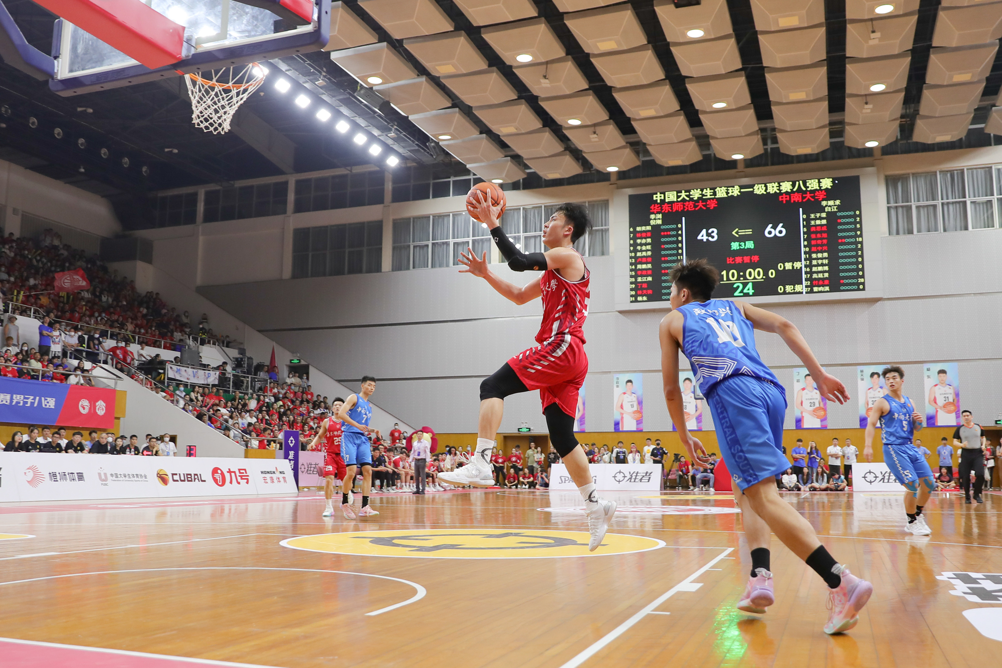 球队依靠内线寻找进攻节奏,卢嘉俊也凭借个人能力一次次突破上篮,奈何全队手感不佳。随着卢嘉俊压哨上篮打中,半场比赛结束,华东师大男篮41:60落后中南大学男篮。