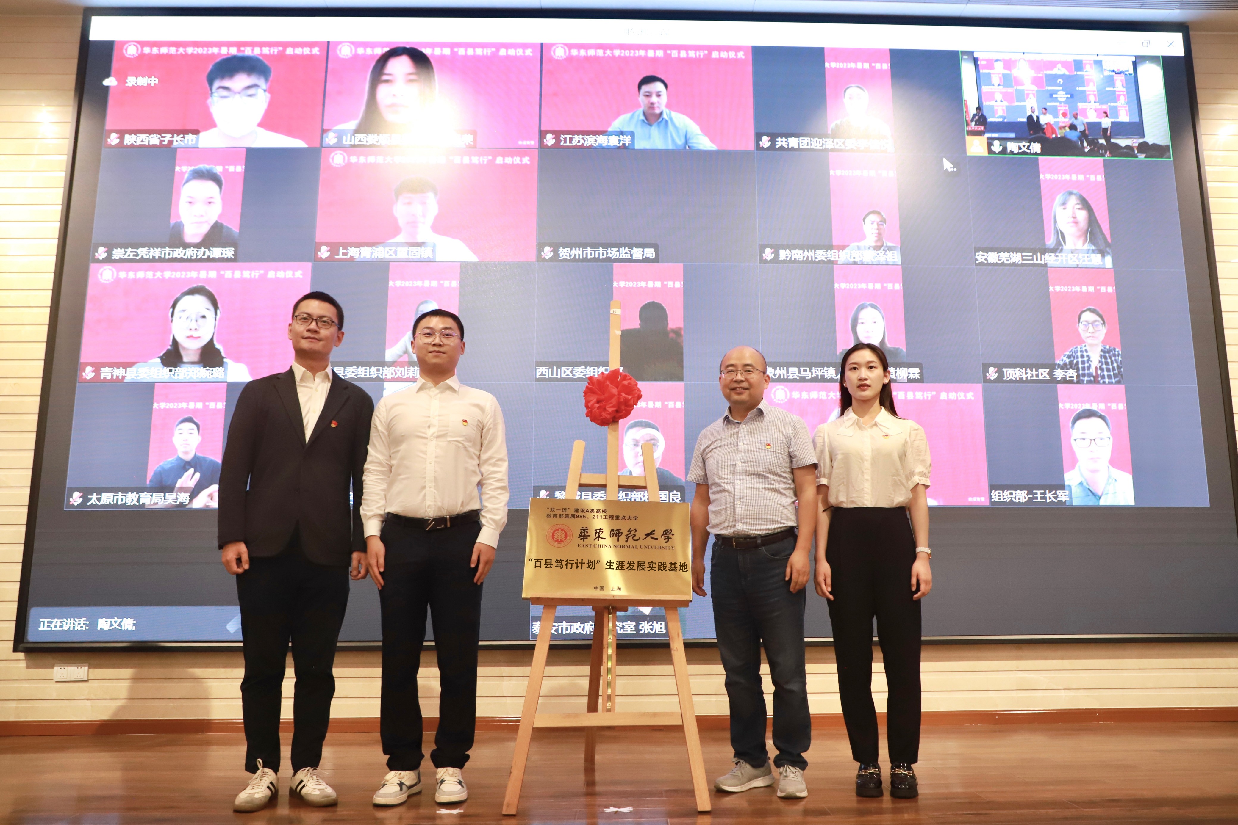 在选调生校友及其所在地方政府的支持下,“百个县域生涯发展实践基地建设计划”已得到30个单位的响应,为学生提供政务实习岗位和相关条件保障,培养和储备优秀人才,共同服务地方社会经济发展。会上,赵健和优秀党员代表、各基地代表线上线下共同为“百县笃行计划”生涯发展实践基地揭牌。