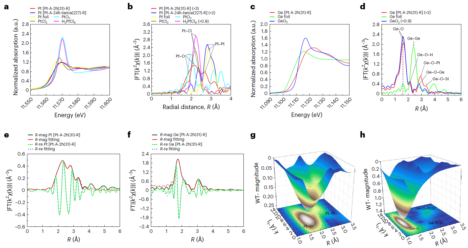 原位XAFS研究表明,最优催化剂Pt-A-2h(31)-R中的Pt物种价态介于0-1之间,线性组合拟合给出了Pt的平均价态为0.576。该催化剂拥有几乎可以忽略的Pt-Pt键散射路径贡献,说明高Ge含量的样品中Pt的尺寸极小(Pt-Pt键配位数大约为3)。重要的是,可以明显观察到位于2.93 Å位置的Ge-O-Pt键的散射路径,且强度很高,证明了Pt是通过Pt-O-Ge键的形式锚定在Ge-UTL沸石上。此外,没有观察到Ge-Ge键的散射路径信号,表明骨架Ge未被还原,仍为原子分散的骨架Ge位点。