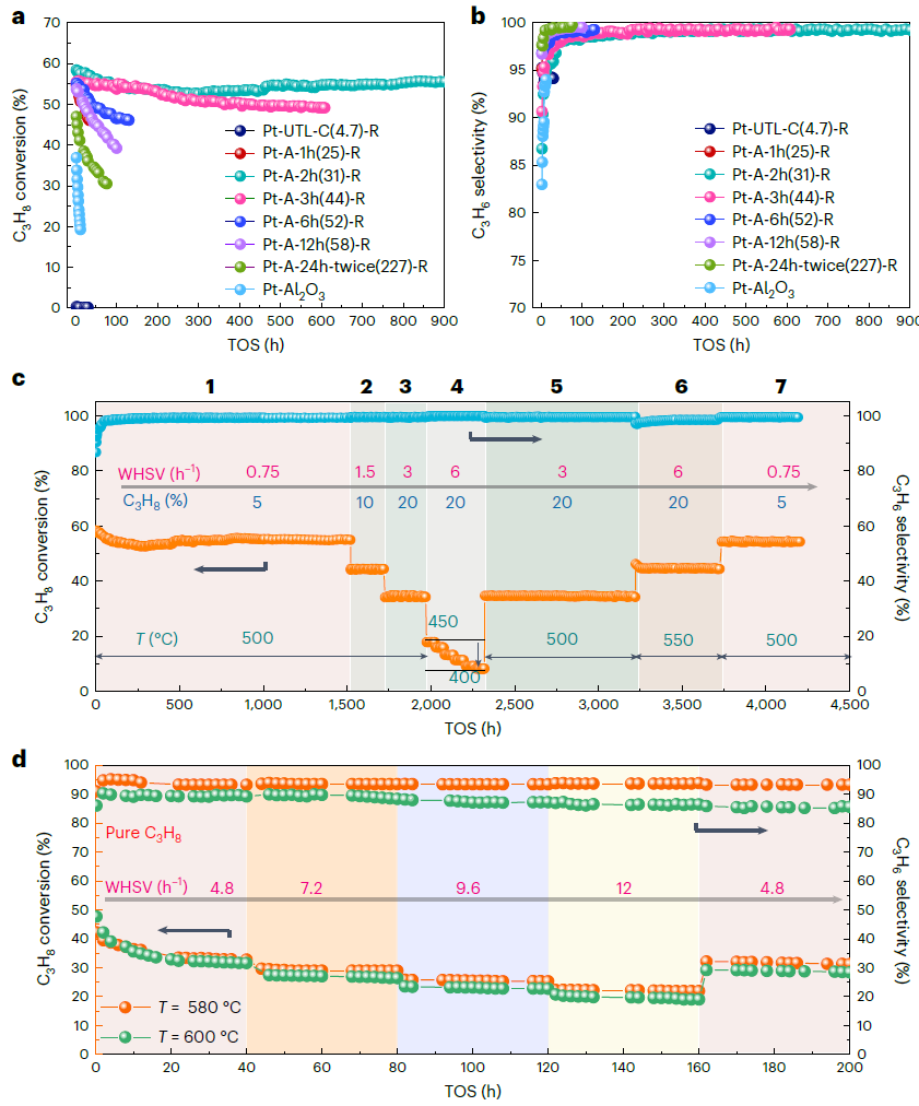 课题组以热/水热结构稳定的Ge-UTL为载体,H2PtCl6为Pt源,采用湿法浸渍制备得到催化剂Pt@Ge-UTL。该催化剂在500oC的反应温度下获得了超过54%的丙烷稳定转化率,99%以上的丙烯选择性。催化剂在不同的丙烷分压,空速以及反应温度下持续稳定催化4200小时。为了满足工业应用需要,课题组还评价了纯丙烷进料、580oC/600oC高温条件下长时间的丙烷脱氢性能,结果表明催化剂具有工业应用前景。