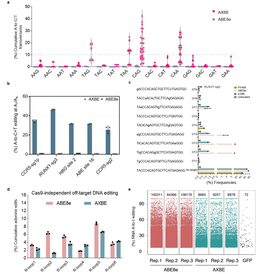 经过大量内源性靶点评价以及体外酶活实验发现AXBE具有YA*R (R=A或G)碱基背景序列(motif)的偏好性。在含有YAR motif的靶点中,AXBE可产生15-32%的A到Y碱基颠换编辑。AXBE在HeLa细胞系中也可达到高达46%的腺嘌呤碱基颠换。通过Cas9依赖性/非依赖性DNA水平脱靶评估以及转录组水平脱靶检测发现,相比于ABE系统,AXBE的脱靶明显降低,尤其是在RNA水平上降低了90%。