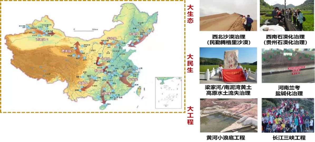 课程团队变革仅以“名山大川”地理典型景观认知为主线组织野外实习的模式,以地理学服务“大战略规划、大工程选址、大生态治理”等主题导向牵引实习教学改革,构建超越知识点的教学。