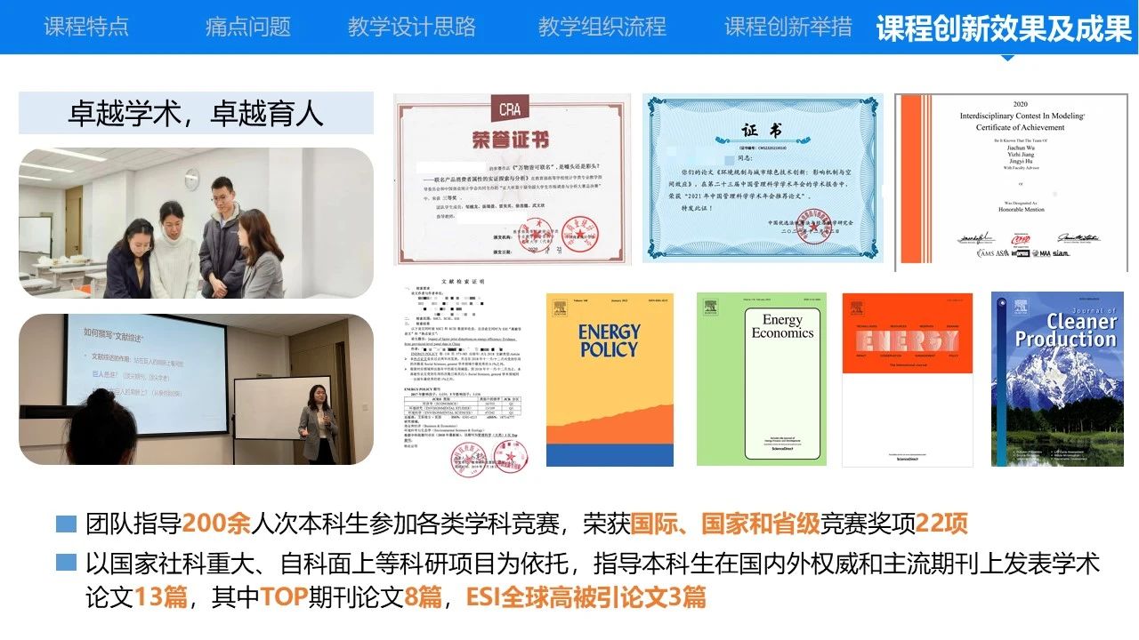 据欧阳晓灵介绍,课程教学创新取得实践育人突出成效,由3名教授和1名副教授组成的团队先后指导200余人次本科生冲击各类学科竞赛,指导本科生在国际TOP期刊发表学术论文8篇,ESI全球高被引论文3篇和热点论文1篇;荣获国际级、国家级学科竞赛项目近20项。