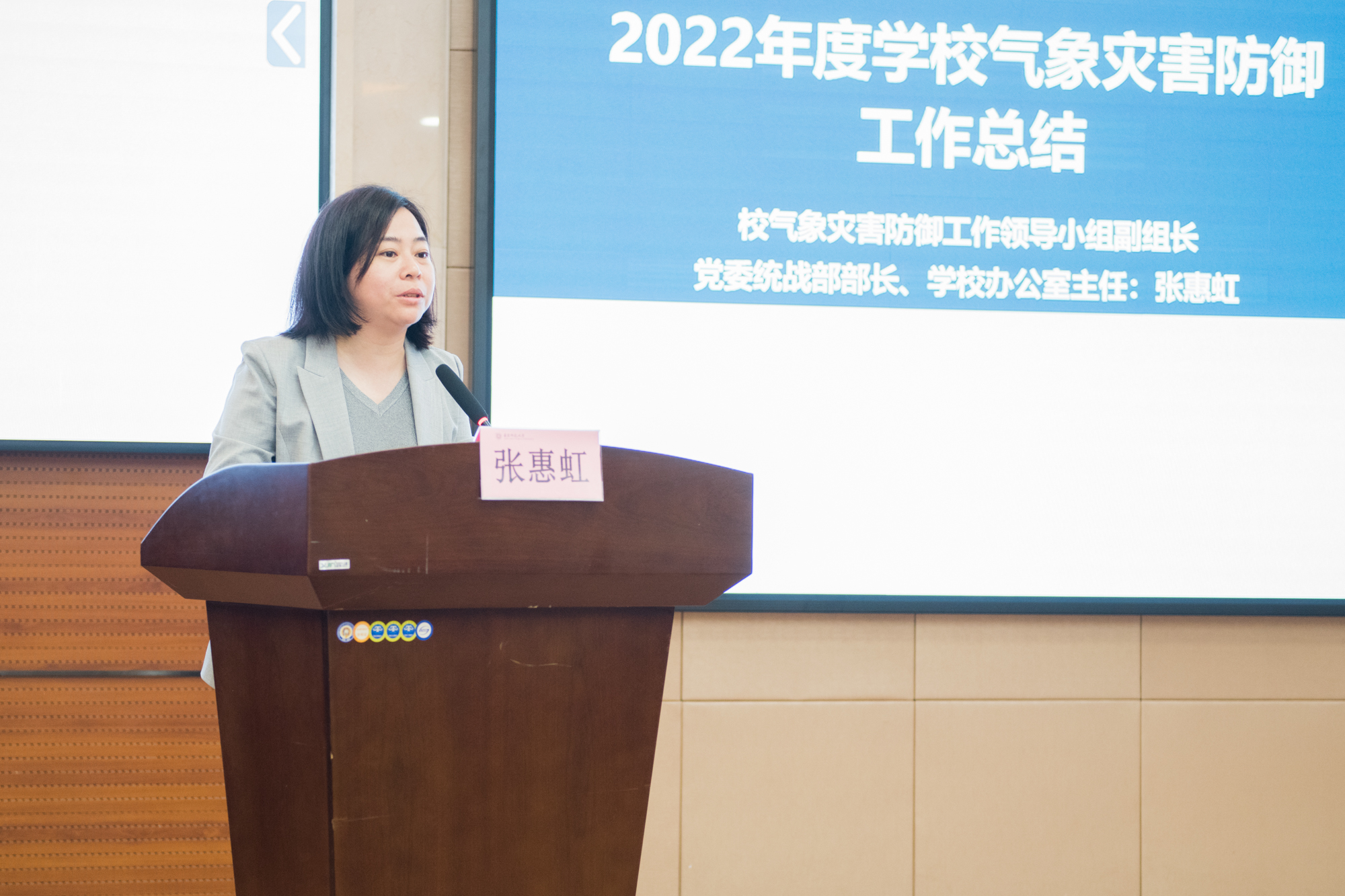校气象灾害防御暨防汛防台工作领导小组副组长、党委统战部部长、学校办主任张惠虹作工作总结