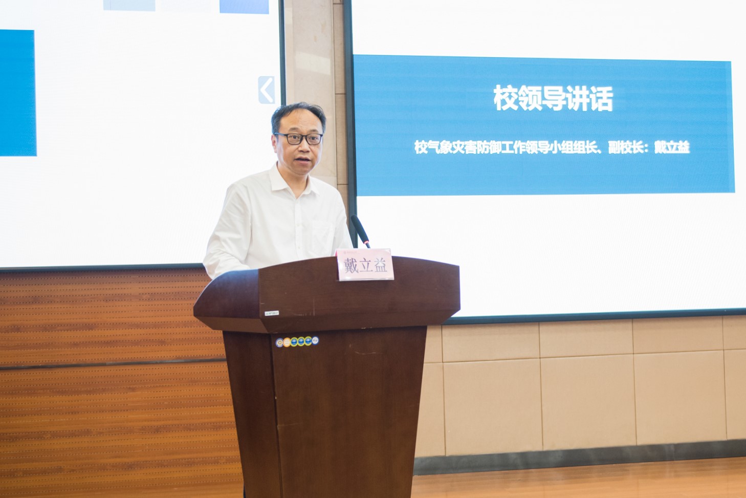 副校长、校气象灾害防御暨防汛防台工作领导小组组长戴立益致辞