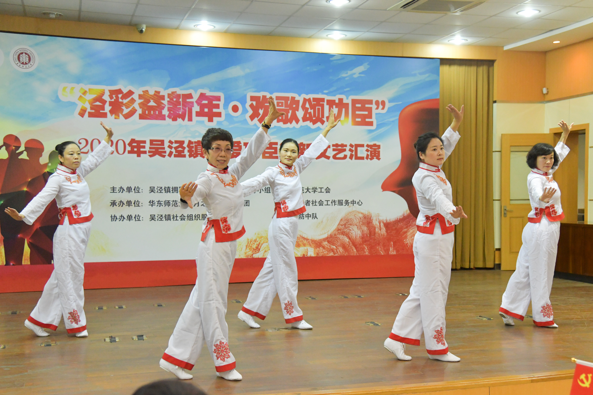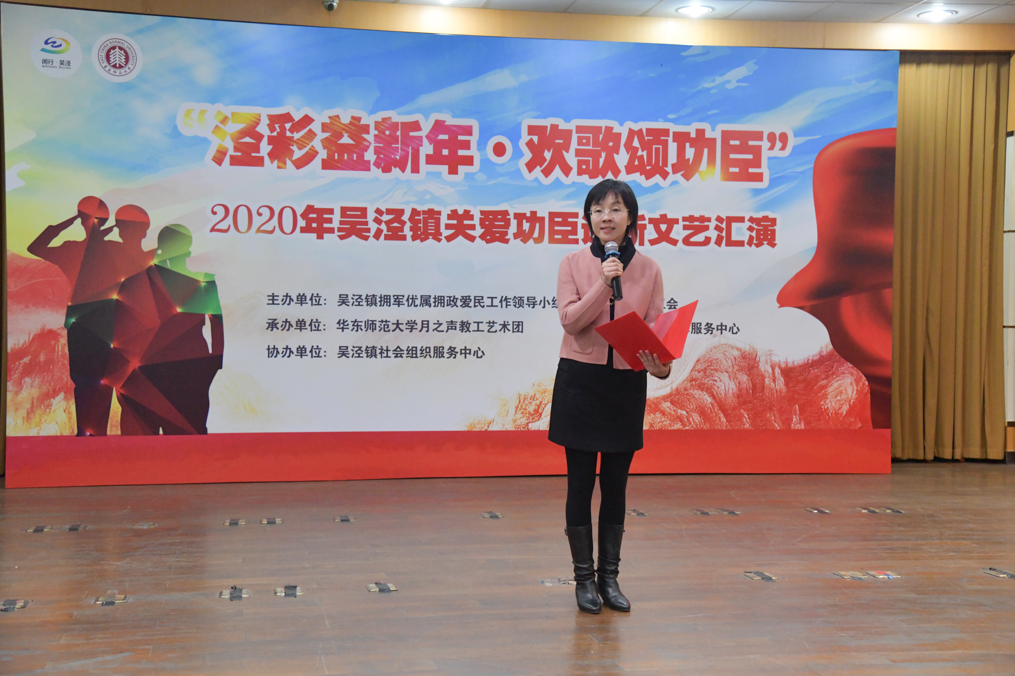 为发扬“拥军优属和拥政爱民”的光荣传统,校工会与吴泾镇双拥工作领导小组联合主办的以“泾彩益新年,欢歌颂功臣”为主题的2020年吴泾镇关爱功臣迎新文艺汇演在吴泾镇社区党校举行。来自吴泾镇的功臣老兵及其家属代表、吴泾消防中队消防员代表、周边社区文艺骨干及居民代表百余人出席。我校音乐学院声乐副教授兼“月之声”教工艺术团艺术总监李明月、校教职工合唱团指挥徐歆,吴泾镇社发办主任张杰、吴泾镇社区事务受理服务中心常务副主任兼吴泾镇退役军人服务站站长谈权飞、吴泾消防中队中队长助理张焕迪、拾星者社会工作服务中心总干事兼吴泾镇社会组织服务中心联合支部书记肖庆出席活动。我校传播学院本科生向林浩和李舜瑶主持活动。