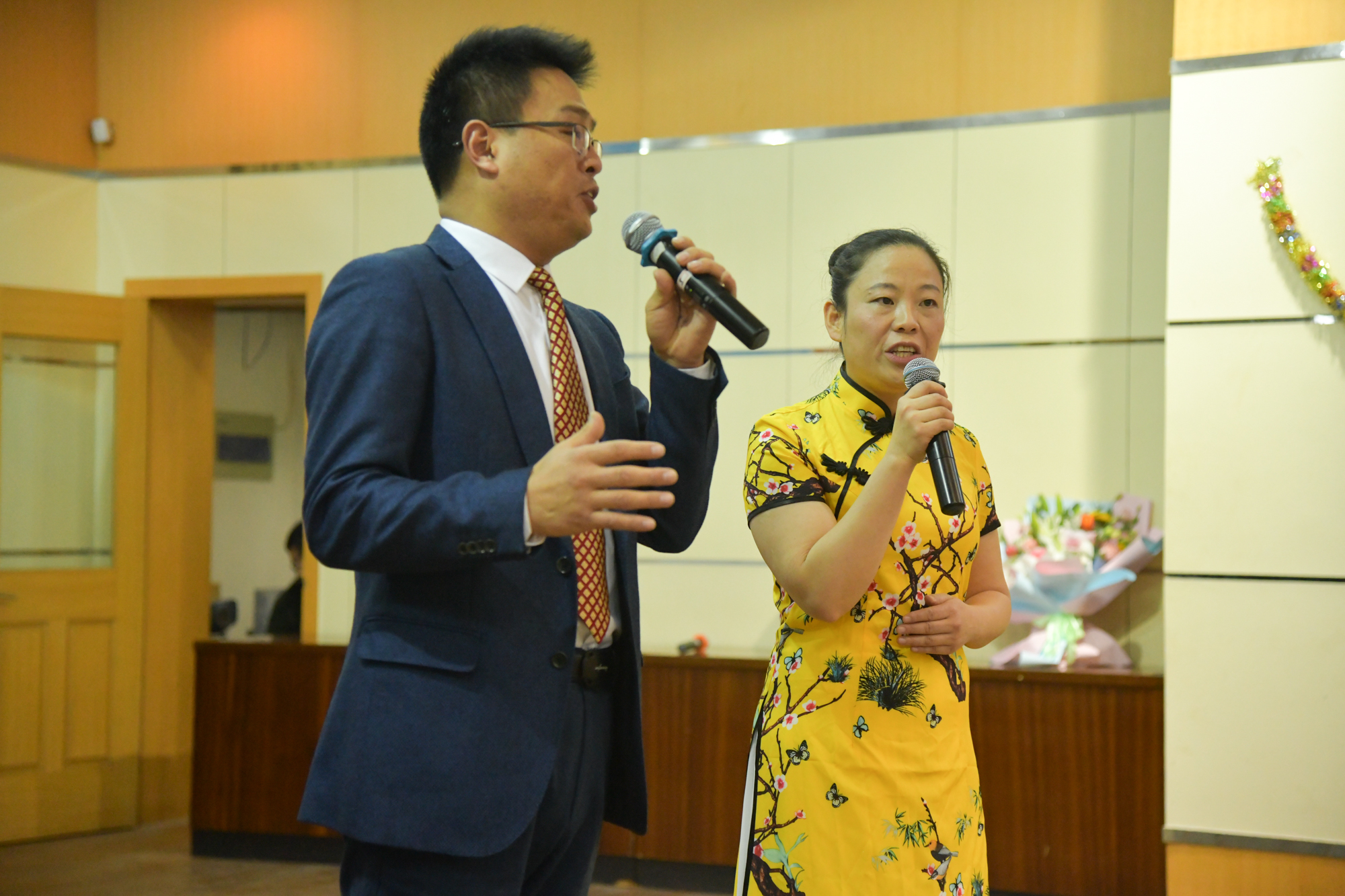 活动最后,张杰和谈权飞上台为李明月和徐歆献花,感谢我校教职工对吴泾镇功臣老兵和居民们的关爱,并表示希望今后继续保持合作,共同服务社会。李明月表示,艺术团老师们都有服务社会的爱心,希望能在四年来的公益演出经验基础上,继续以艺术提升生活品质,把满怀希望的生命力带给更多的人,共创美好社会。他们还对现场观看演出的观众们致以热情洋溢的新年祝福。