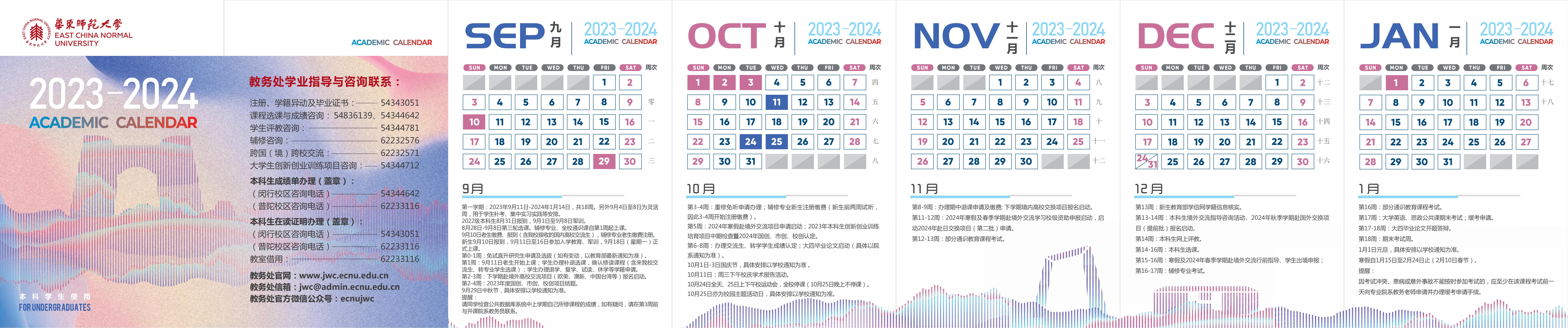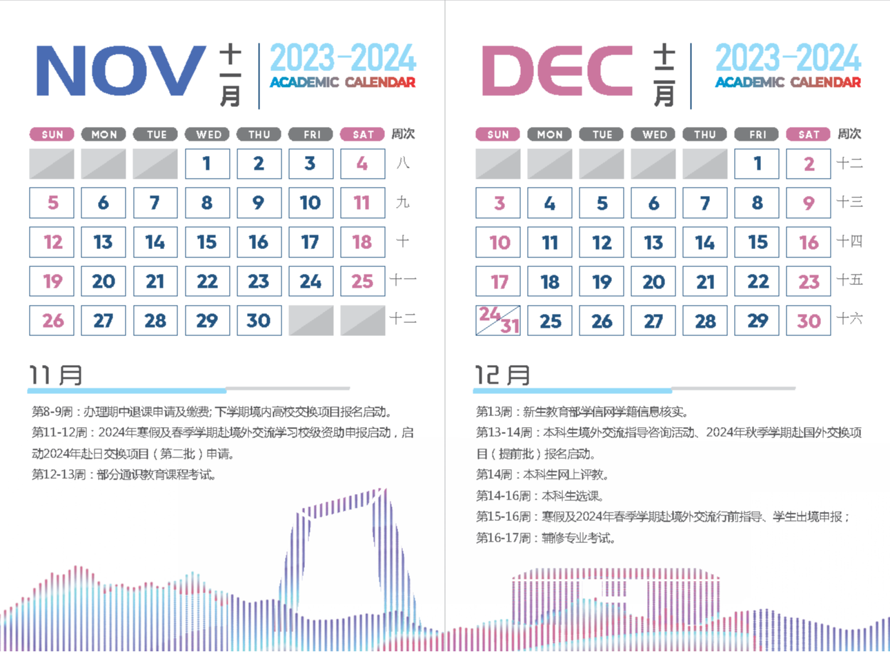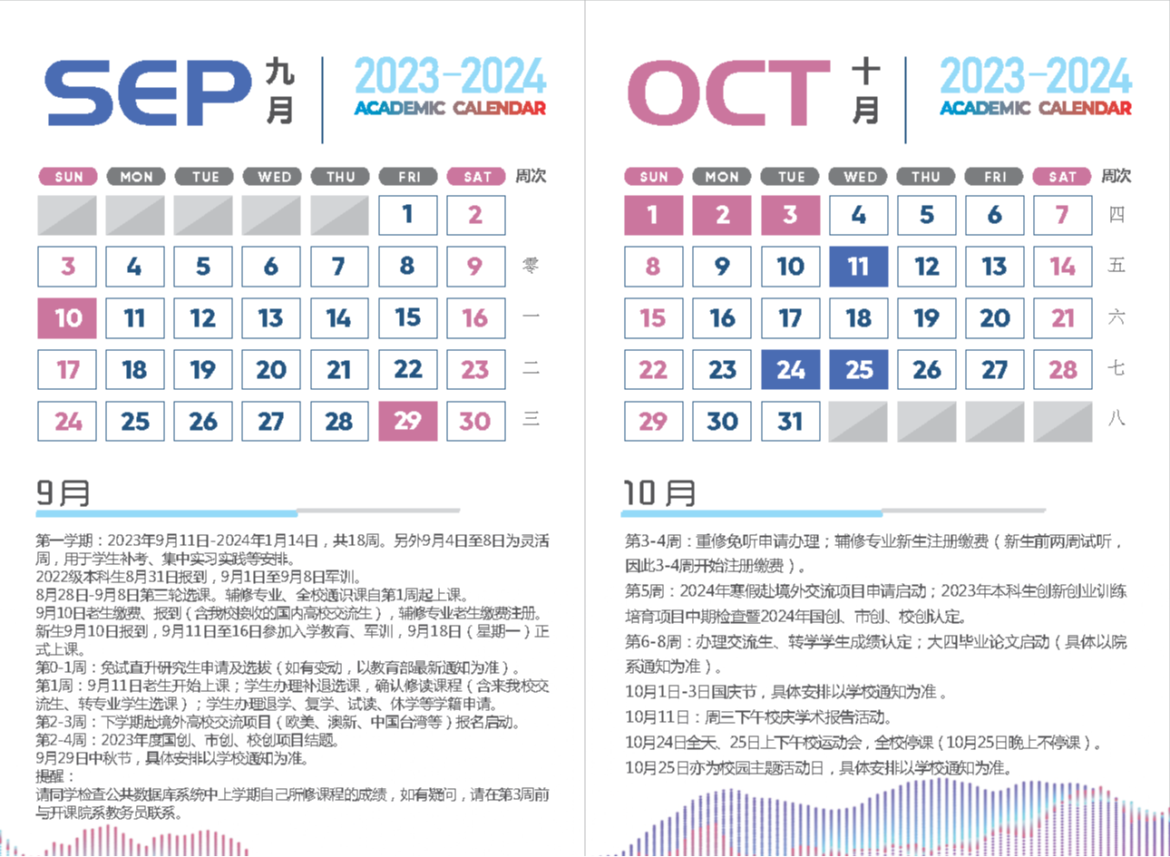 9月11日至2024年1月5日为教学周,1月8日至12日为期末考试周。全校通识课、辅修专业自第1周起上课。