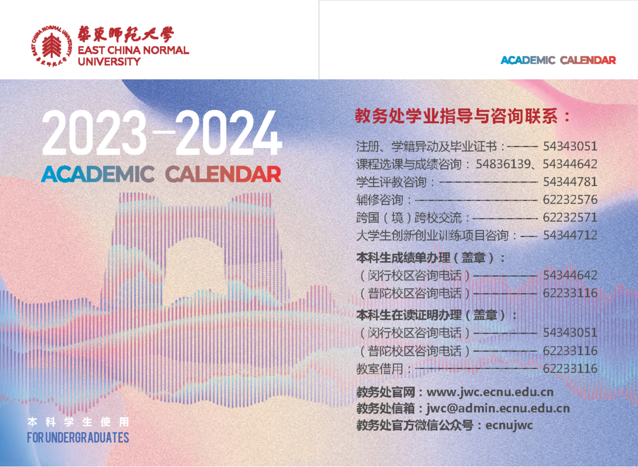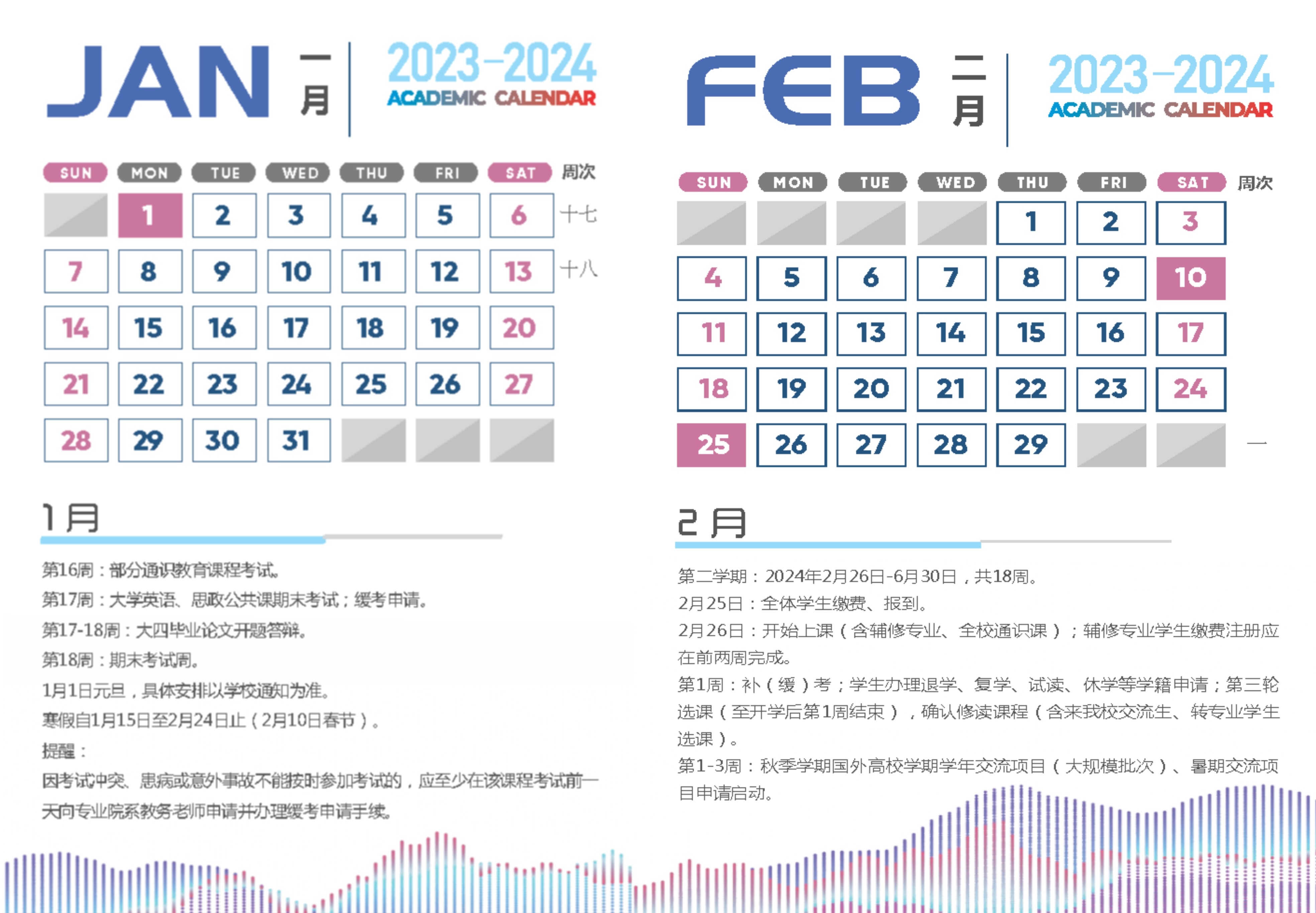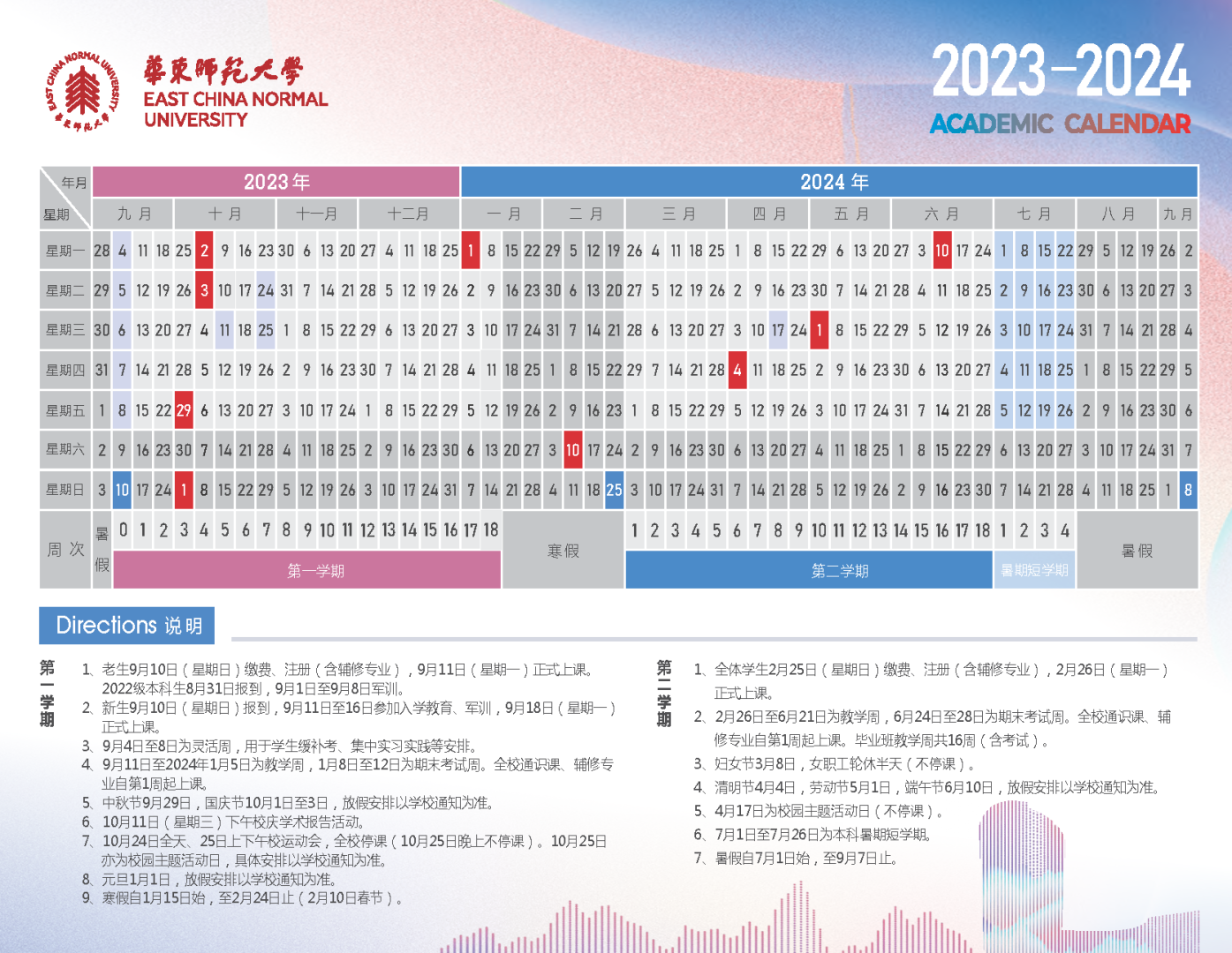 9月11日至2024年1月5日为教学周,1月8日至12日为期末考试周。全校通识课、辅修专业自第1周起上课。