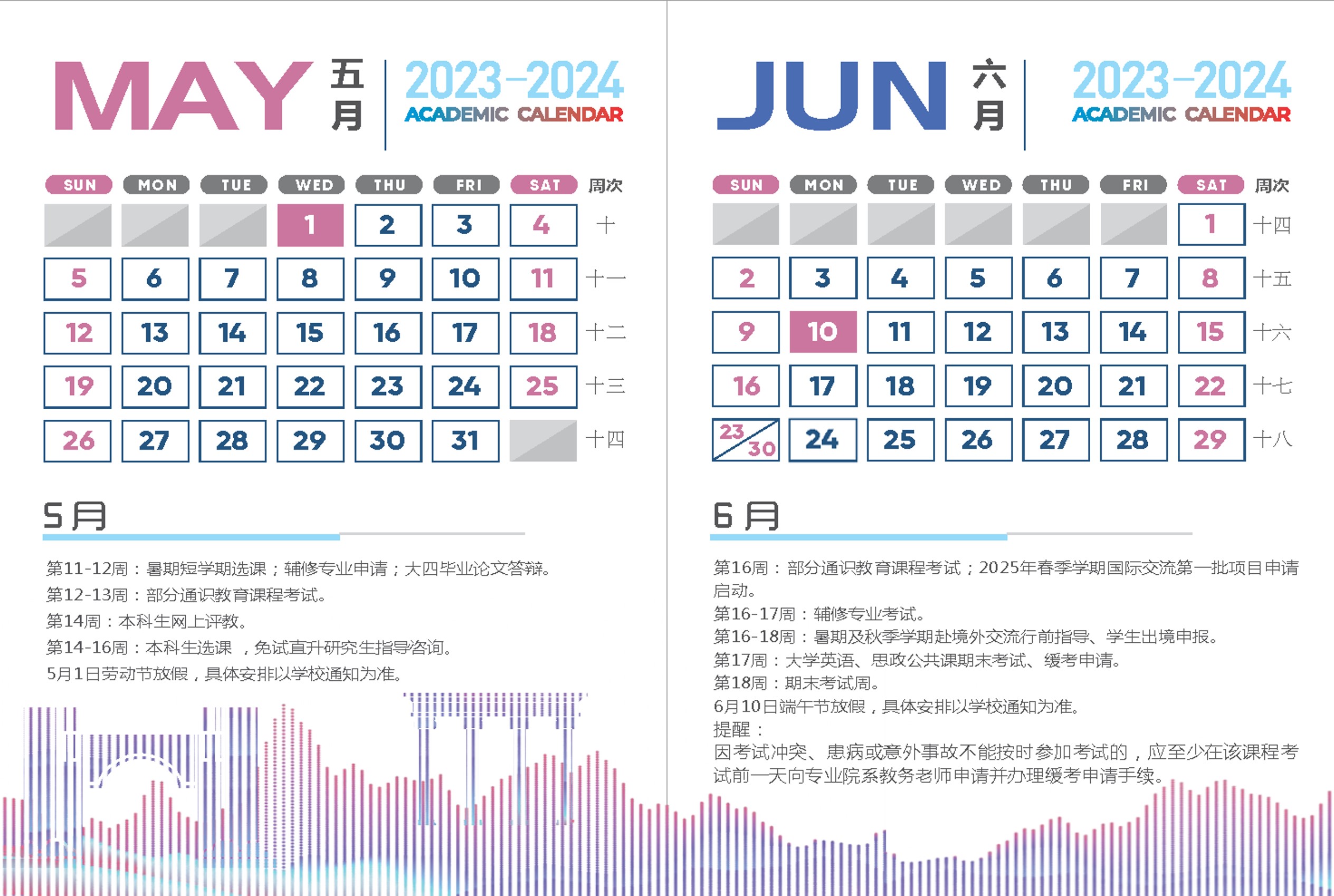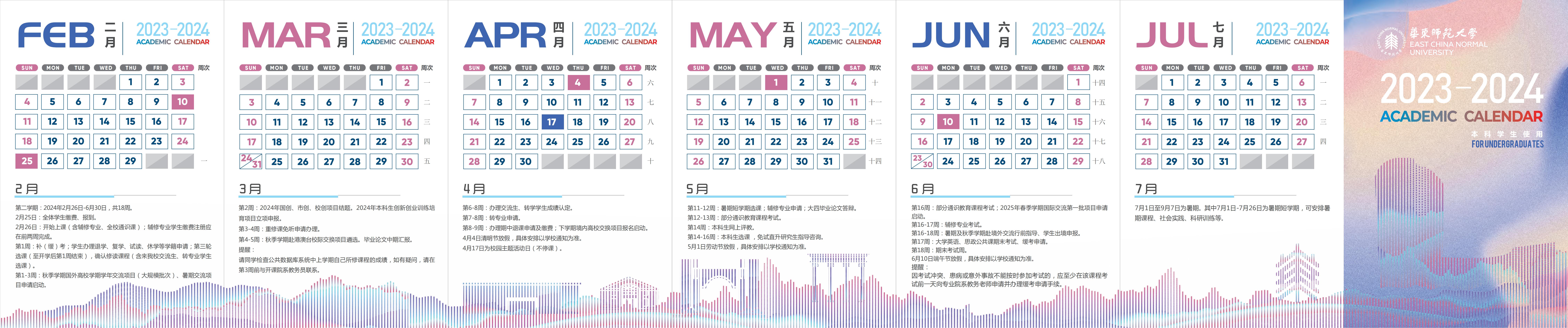 2月26日至6月21日为教学周,6月24日至28日为期末考试周。全校通识课、辅修专业自第1周起上课。毕业班教学周共16周(含考试)。