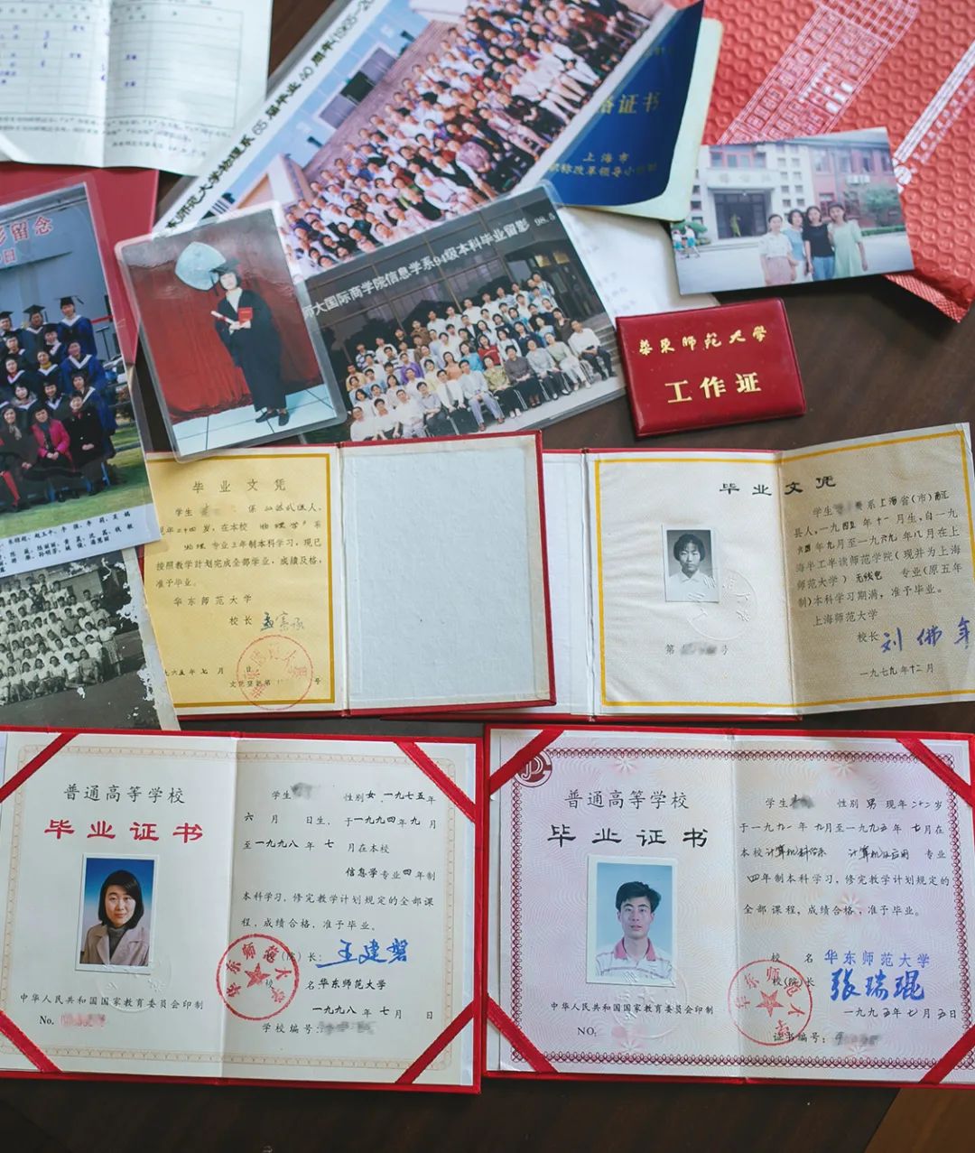 小万同学家中,珍藏了许多有着华东师大记忆的老物件,其中包括6本有着不同时期历任校长签名的毕业证书,60多年的时光在每一本不尽相同的证书封面上流淌。他们在不同年代报考华东师大的原因可能不尽相同,但一脉相承的华东师大精神像种子一样开花结果,如今已枝繁叶茂。