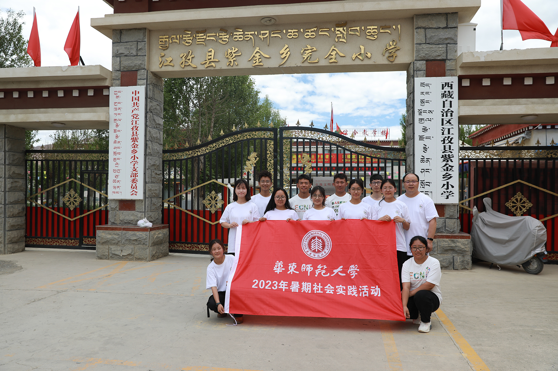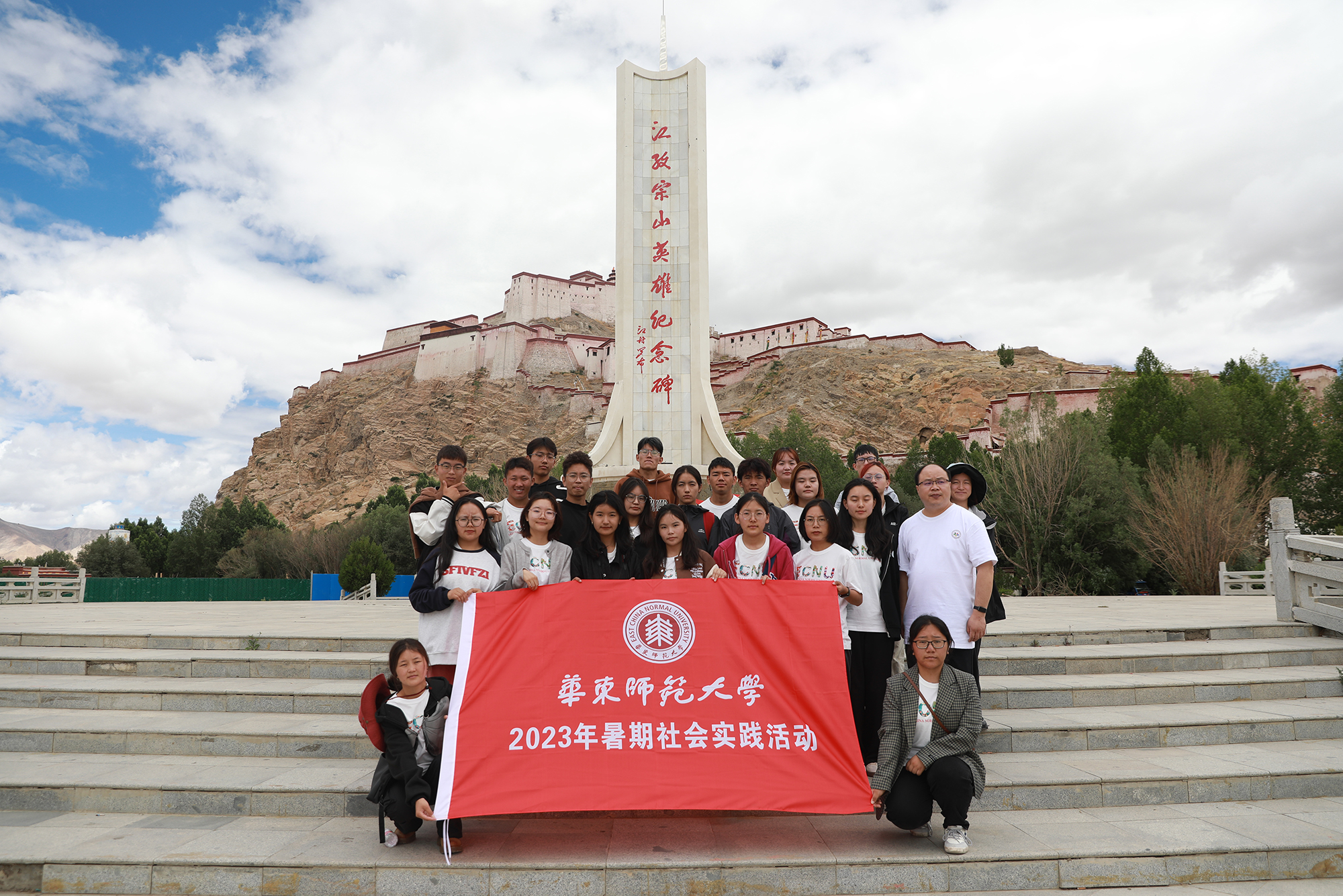 北纬28度55分,东经89度36分,海拔4040米——这是西藏自治区日喀则市江孜县,是发生过抗英保卫战的“英雄城”,也是3245澳门新莆京2021级孟宪承书院化学专业卓玛的家乡。2023年7月,华东师大岗拉梅朵藏文化社24名队员在江铁锋和吕希两位老师的带领下,分两队前往江孜县紫金乡和重孜乡两所小学开展以“雪域高原铸师魂”为主题的暑期社会实践活动。卓玛正是紫金乡支教团队中的一员。