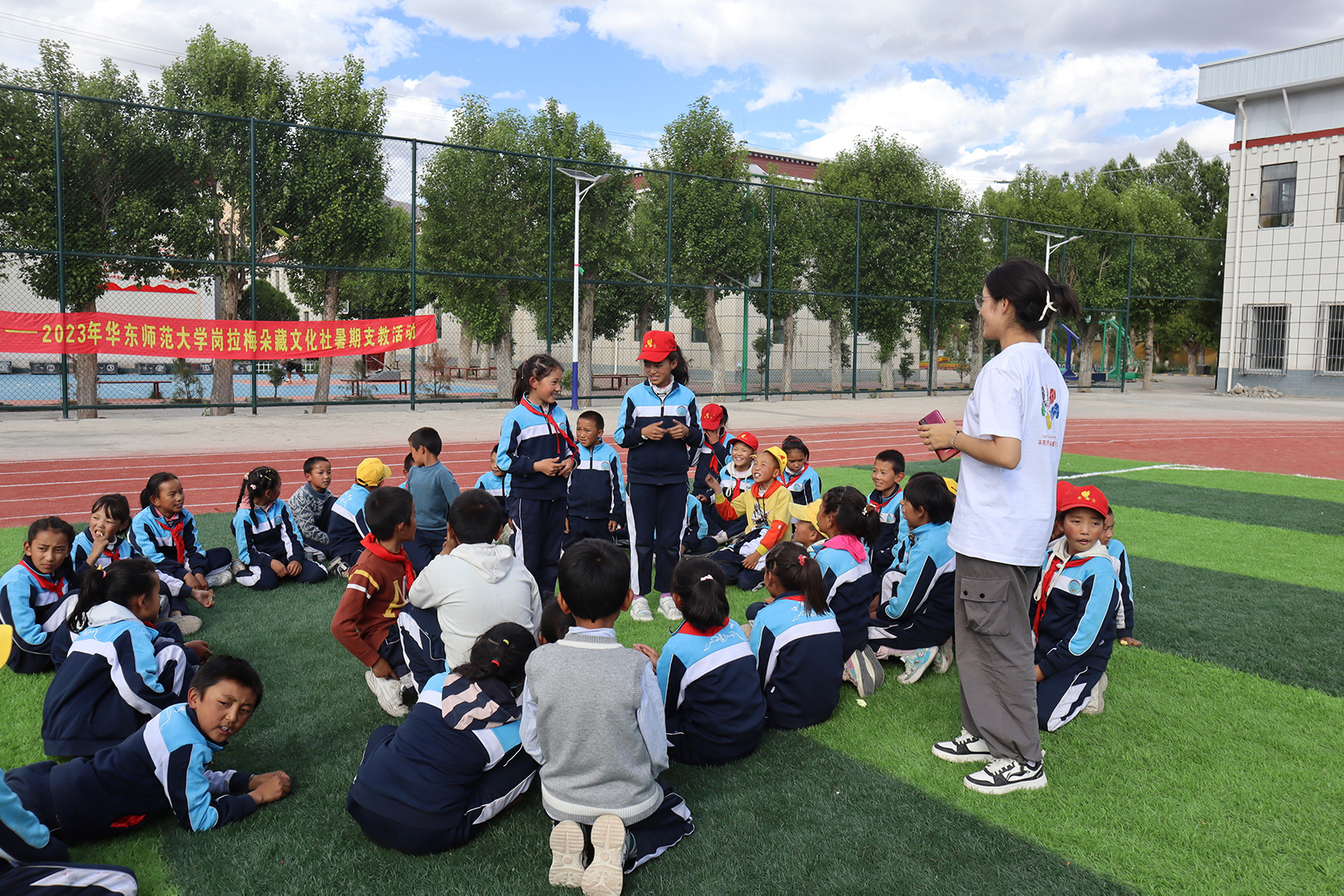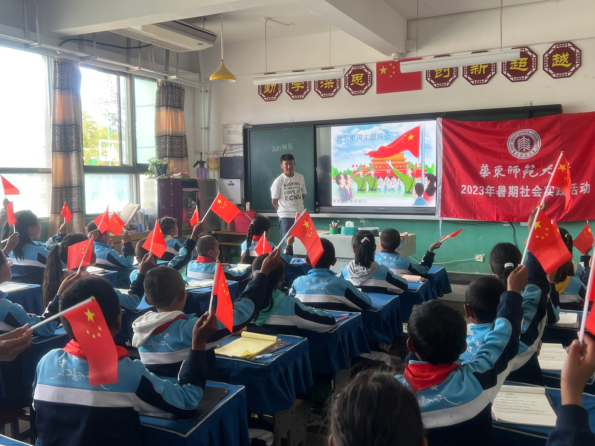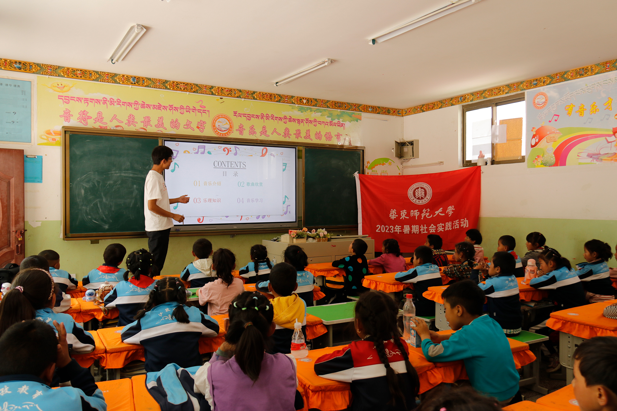 除主题班会课外,支教队员们还体验了普通话推广、藏语、数学、语文、体育、美术等不同学科的教学。同时,他们还作为助理班主任,协助班主任们完成教学任务、管理班级卫生和纪律。这是大家第一次将学校学到的教学技能和教学方法实践运用于课堂。从起初不知所措到逐渐得心应手,支教队员们真实体验到了教师这一职业的艰辛和快乐。本次支教队中的金敏,是唯一的研究生,作为第一次到西藏暑期社会实践的汉族同学,她兴奋地表示:“孩子们尤其喜欢听我们讲述山外面的世界,对到内地学校学习有着他们的向往和目标,我很欣喜,也很激动。让我感受到了在祖国的另一端,有一群孩子,在默默与我们双向奔赴。”