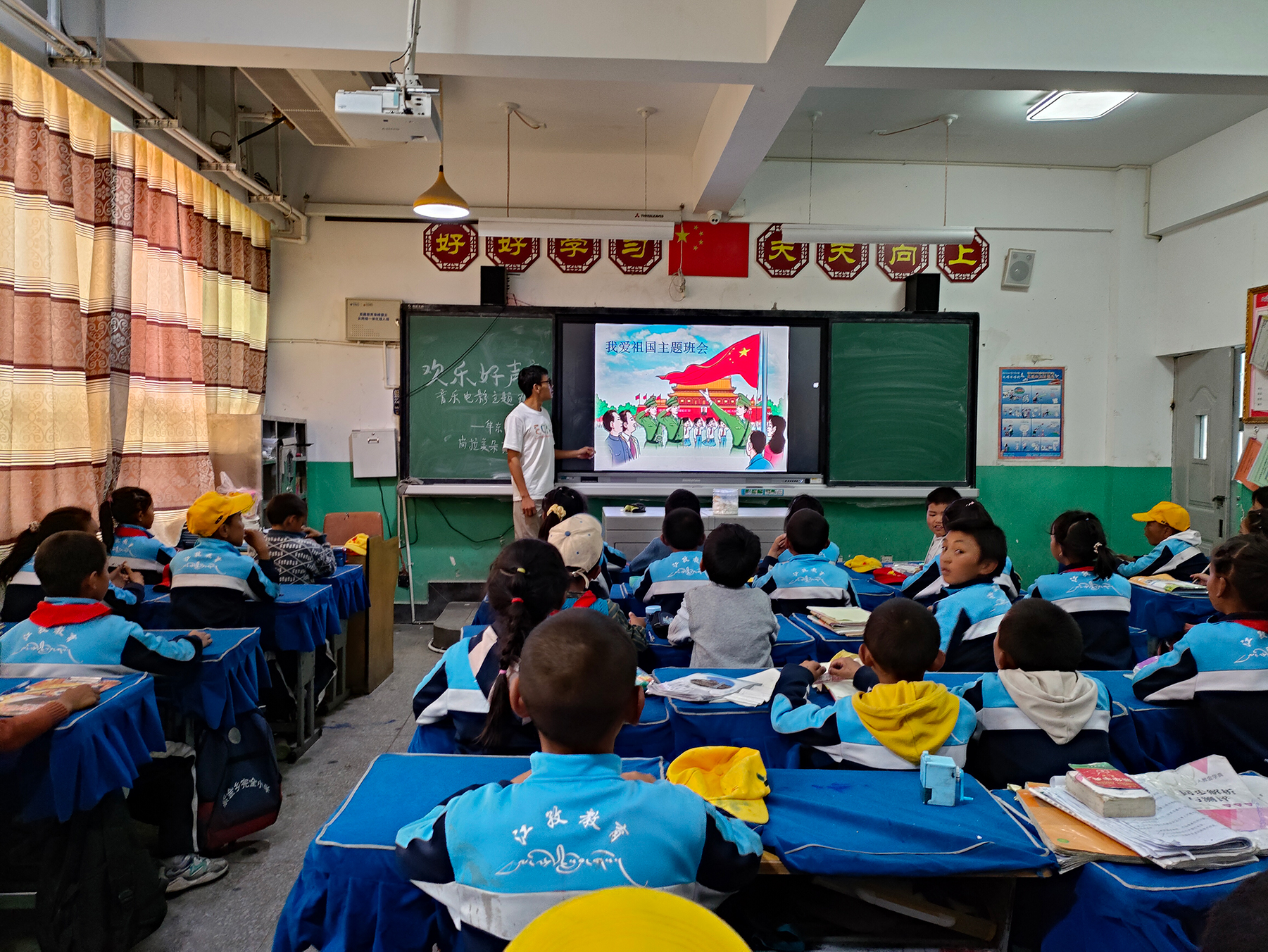 历时三天,长途跋涉超过60小时,支教队员们终于抵达两所乡里的小学。简短的物资交接仪式后,支教正式开始。学校此时已临近期末,怎样才能让孩子们既保持学习动力又保持放松心态呢?经过行前多次讨论,队员们最终决定针对不同年级,开展形式多样的以梦想、党史、音乐、电影、手工为主题的班会课。