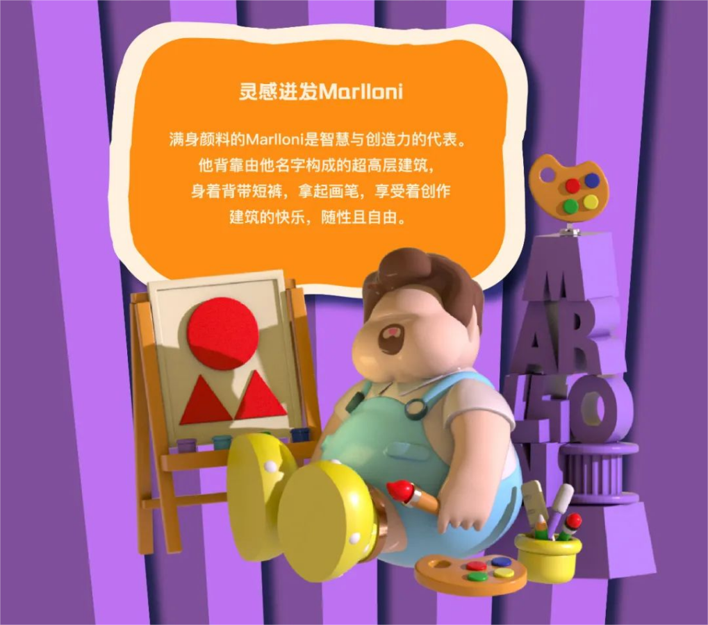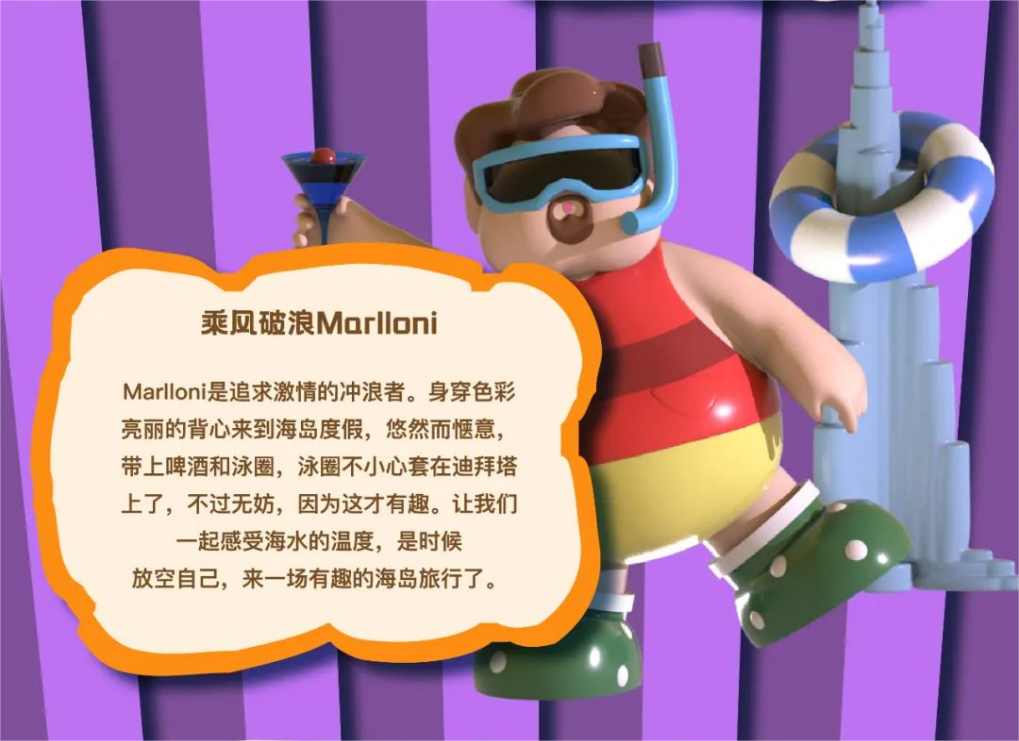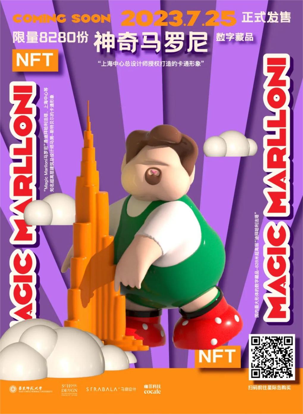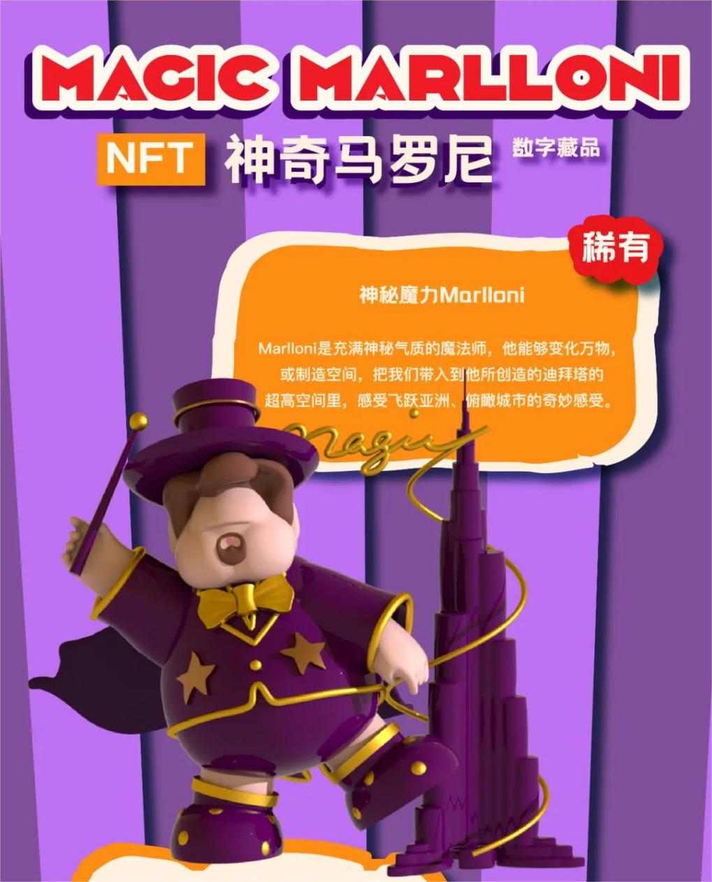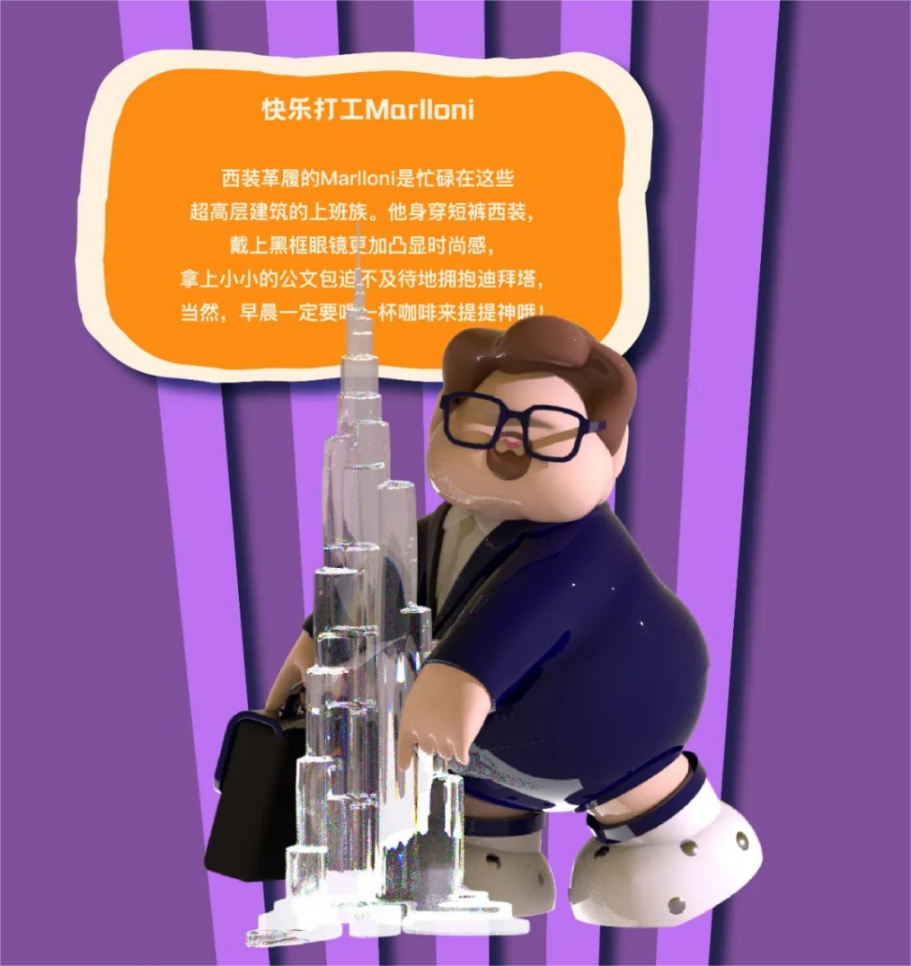 本次首发的Marshall形象NFT名为神奇马罗尼(“Magic Marlloni”是迪拜塔、上海中心总设计师马溯-斯特贝尓的卡通形象”), Magic Marlloni是多元宇宙视角下,以设计师Marshall和他设计的迪拜哈利法塔等超高层建筑为灵感,展开的天马行空的想象,更是当下都市群体的工作百态和业余生活的缩影。