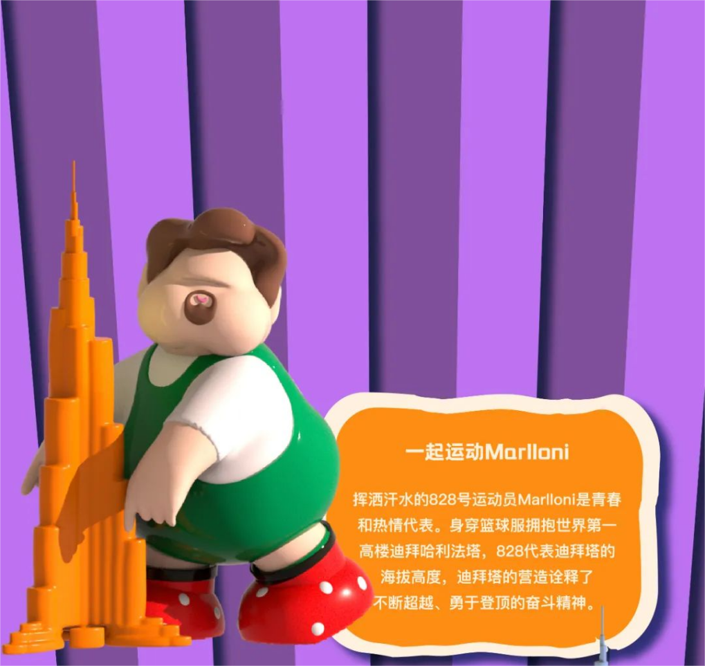 在平行宇宙中,胖乎乎的Marlloni,充满热情与活力,拥有多重身份,迪拜哈利法塔和由Marlloni名字组成的超高层建筑随着Marlloni的形态发生变化。