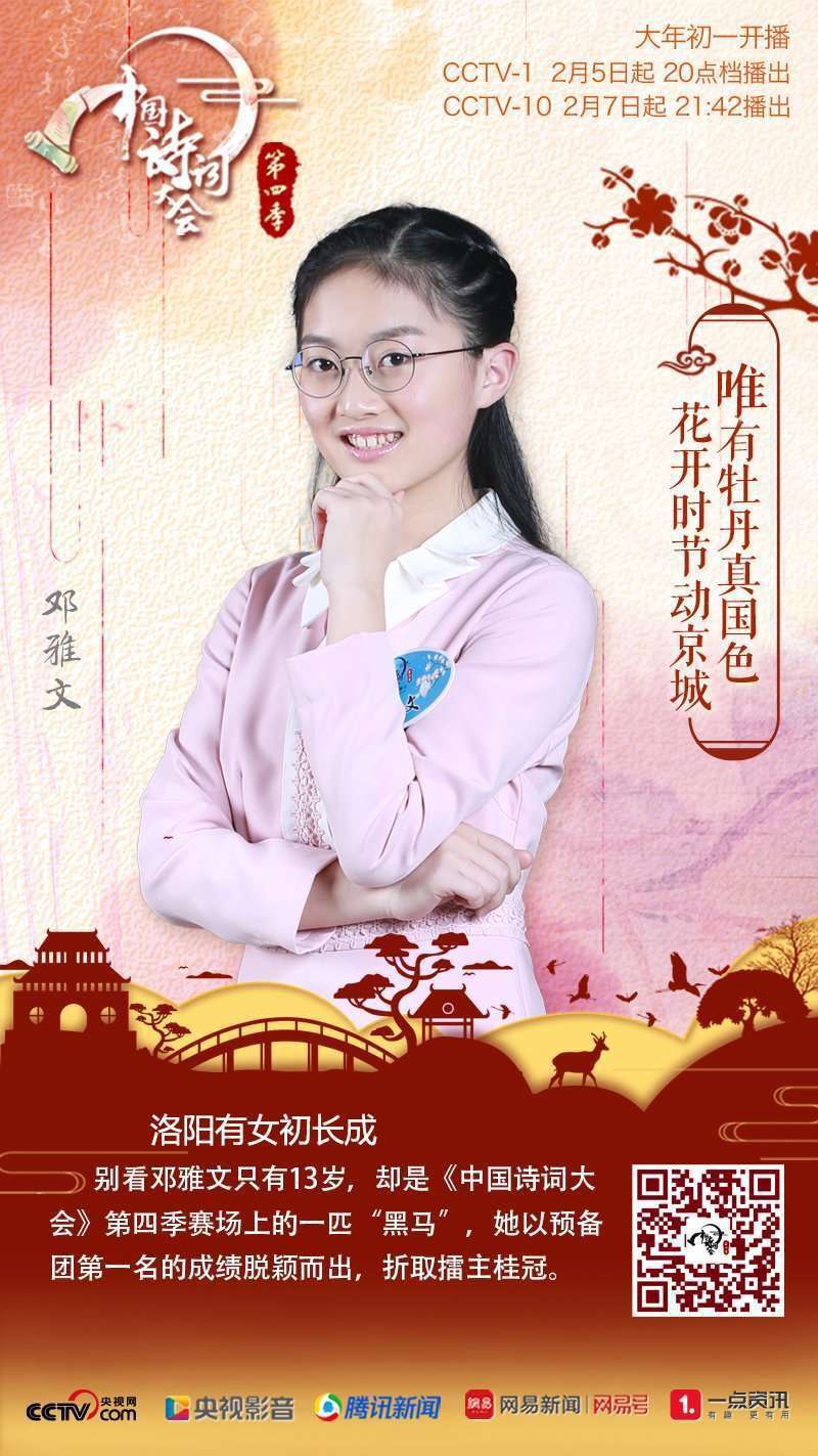 2019年,年仅十三岁的邓雅文参加了《中国诗词大会》第四季,一路过关斩将,成为了第四季唯一的一位四期擂主,也让全国观众认识了这位腹有诗书气自华的小才女。采访中,她说她最喜欢的诗人是唐朝的刘禹锡,最喜欢那一句“唯有牡丹真国色,花开时节动京城”。“我希望自己可以像家乡的牡丹花一样,精彩盛放的同时,有着坚贞高雅的品格。”