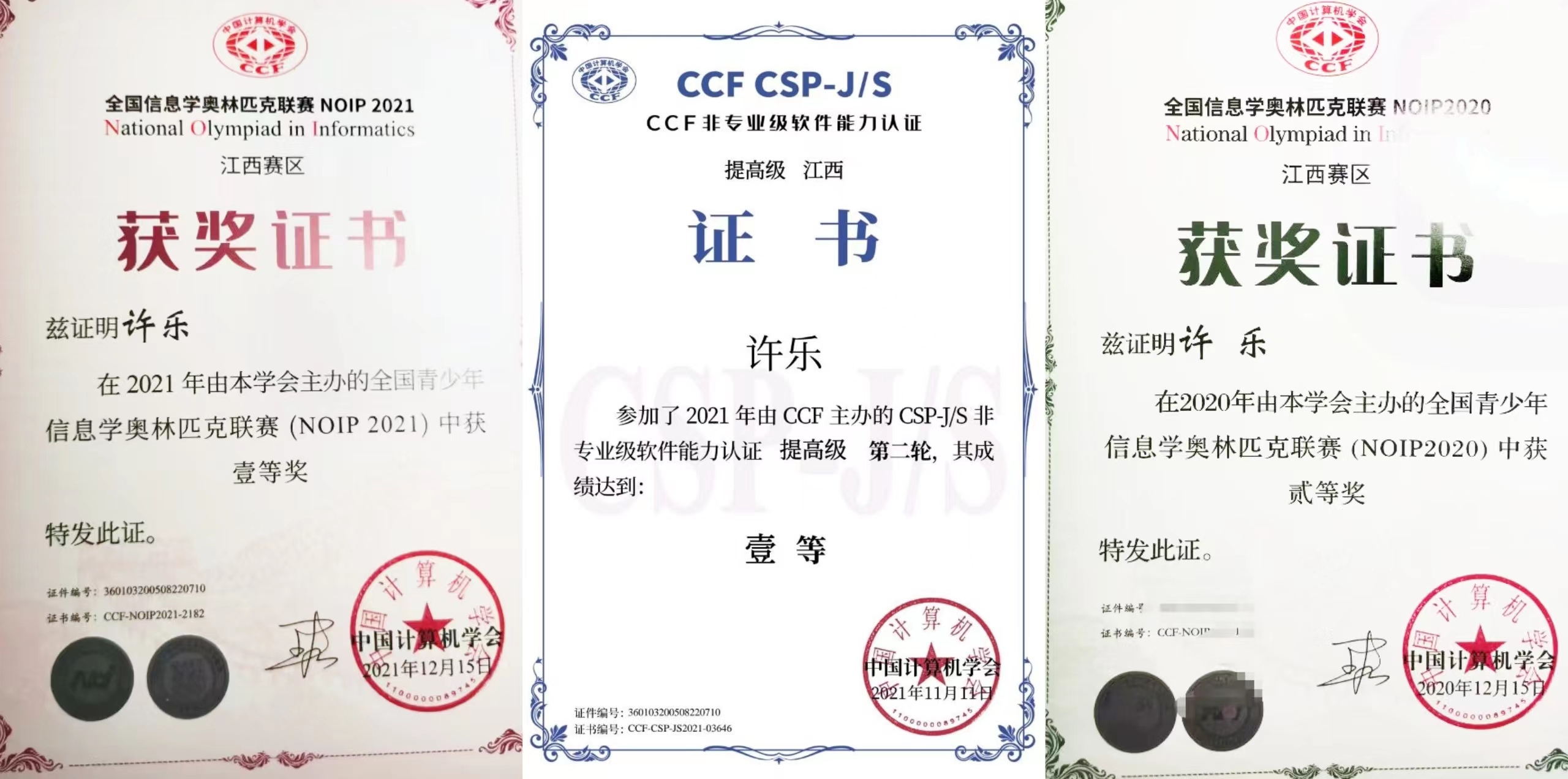 在2020年的NOIP联赛(全称National Olympiad in Informatics in Provinces,即全国青少年信息学奥林匹克联赛)中,许乐获得江西赛区二等奖。2021年的NOIP联赛,他取得江西赛区一等奖的好成绩。