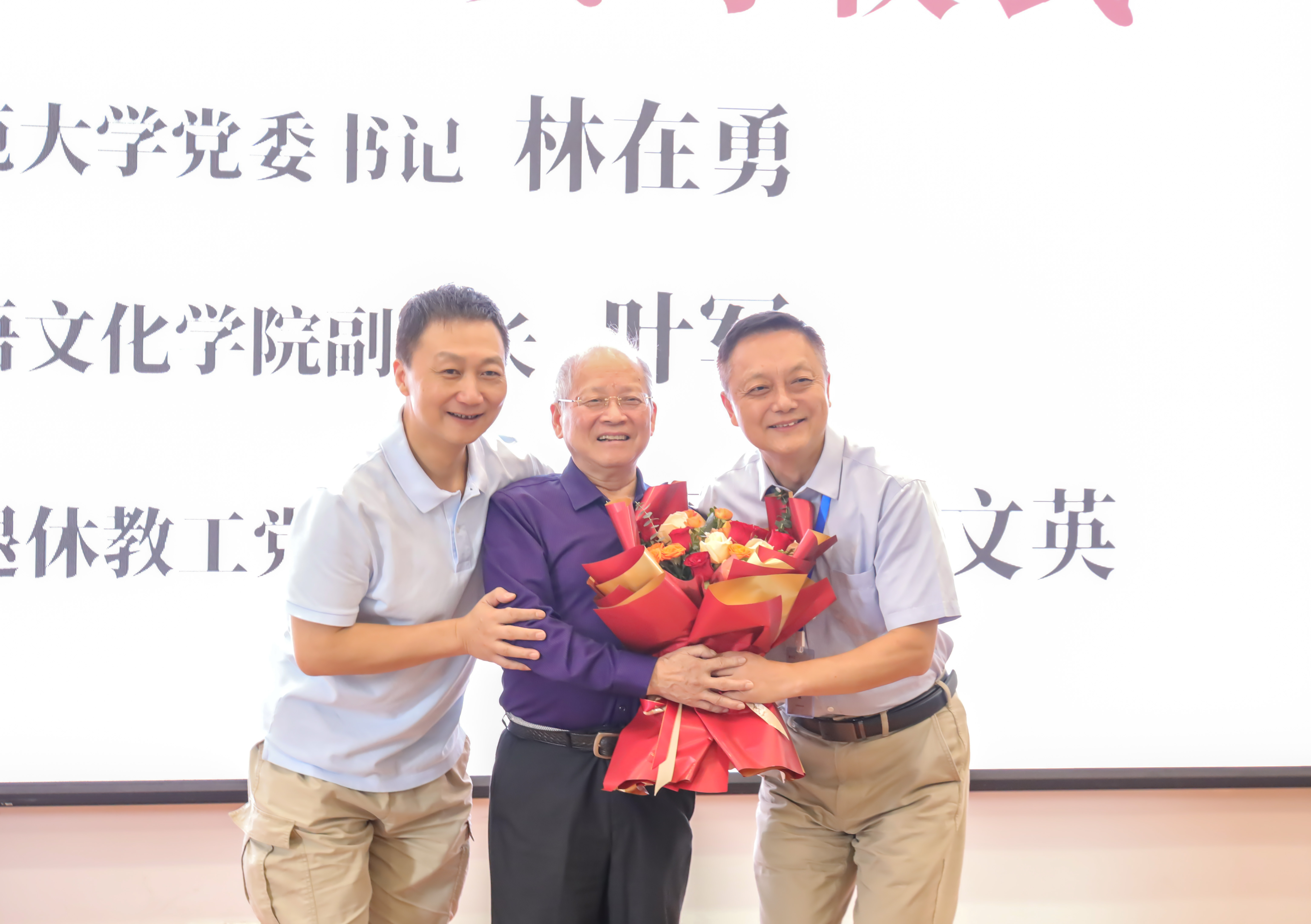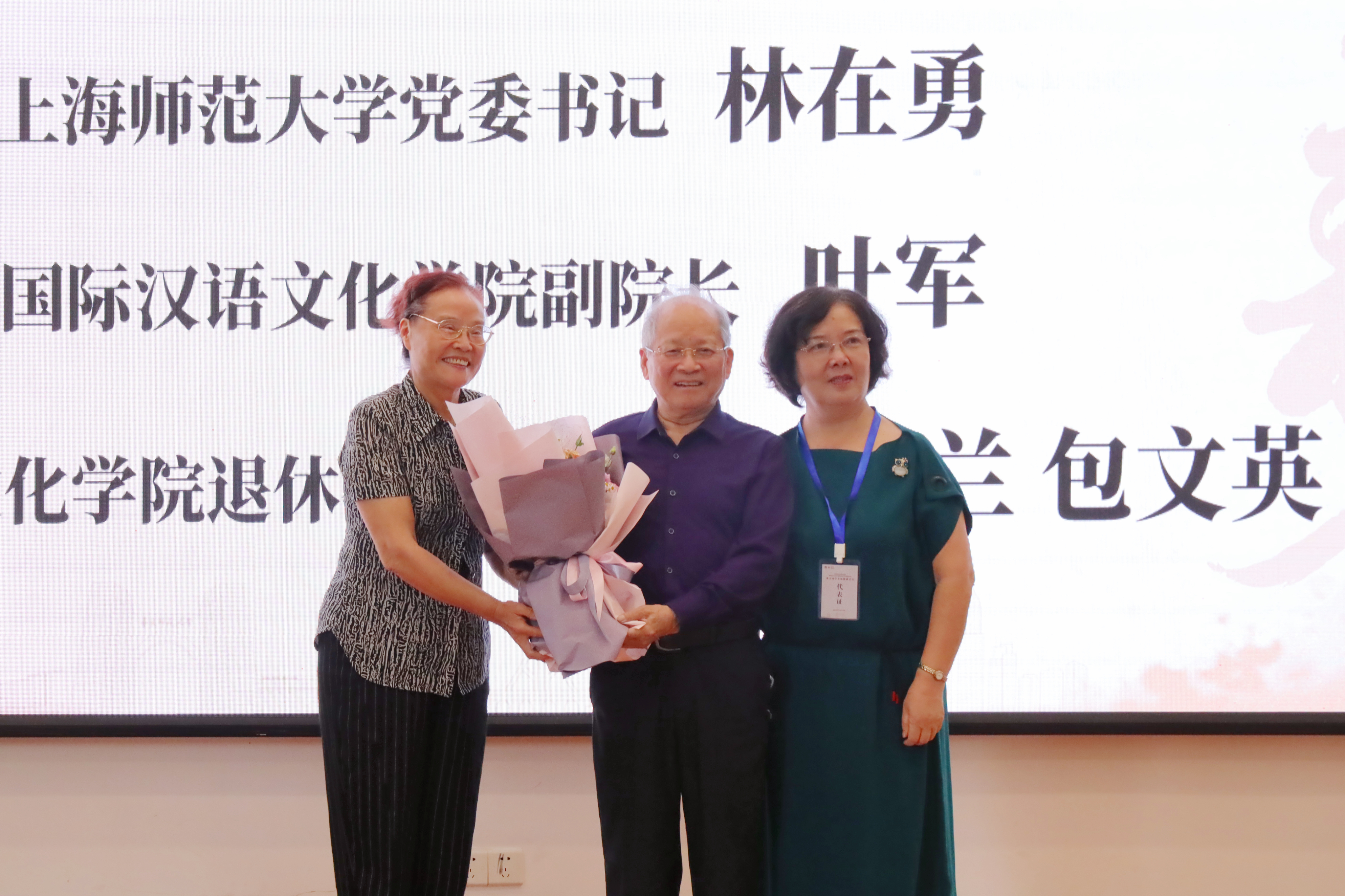 在随后进行的潘文国先生贺寿仪式上,上海师范大学党委书记林在勇作为学生代表发言。林在勇深情回忆了自己跟随潘先生学习的经历,讲述了恩师努力拼搏无私奉献,爱生如子的感人事迹,表达了对恩师的由衷谢意。华东师大国际汉语文化学院副院长叶军、退休教工党支部教师代表刘同兰、包文英也纷纷献花敬贺。