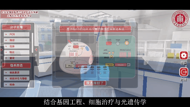 华东师大《光控定制细胞用于血糖稳态控制的虚拟仿真实验》带来了飞跃式的改变。基于华东师大医学合成生物学研究中心的前沿科研成果,凝练构建了多学科交叉、时空扩展的虚拟仿真综合实验教学平台,学生可随时随地自由、全面的在线学习合成生物学的设计思想、实验原理和实验技能等。