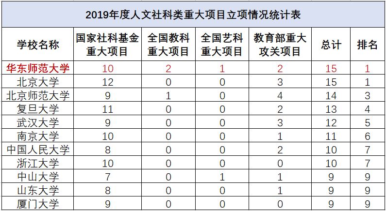 目前,人文社科类全国公开招标的重大项目包括国家社科基金重大项目、全国教科重大项目、全国艺科重大项目以及教育部重大攻关项目。2019年度,我校共获得15项人文社科类重大项目立项,立项总数与北京大学并列全国第一。其中,我校获得国家社科基金重大项目10项,全国教科重大项目2项,全国艺科重大项目1项,教育部重大攻关项目2项。立项课题主要分布在哲学、经济学、政治学、宗教学、中国文学、语言学、社会学、生态学、教育学等学科。