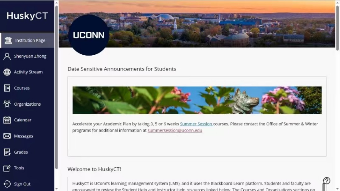 除了多元生动的课堂教学,项目同样也采用了混合式教学为师生提供了多元广阔的交流机会。同学们通过登录康大教学系统HuskyCT交流互动,下载文献资料、开展课前预习与讨论,教授们也根据同学们的反馈设计互动内容,通过由浅入深的系统化教学培养同学们的科研综合能力。