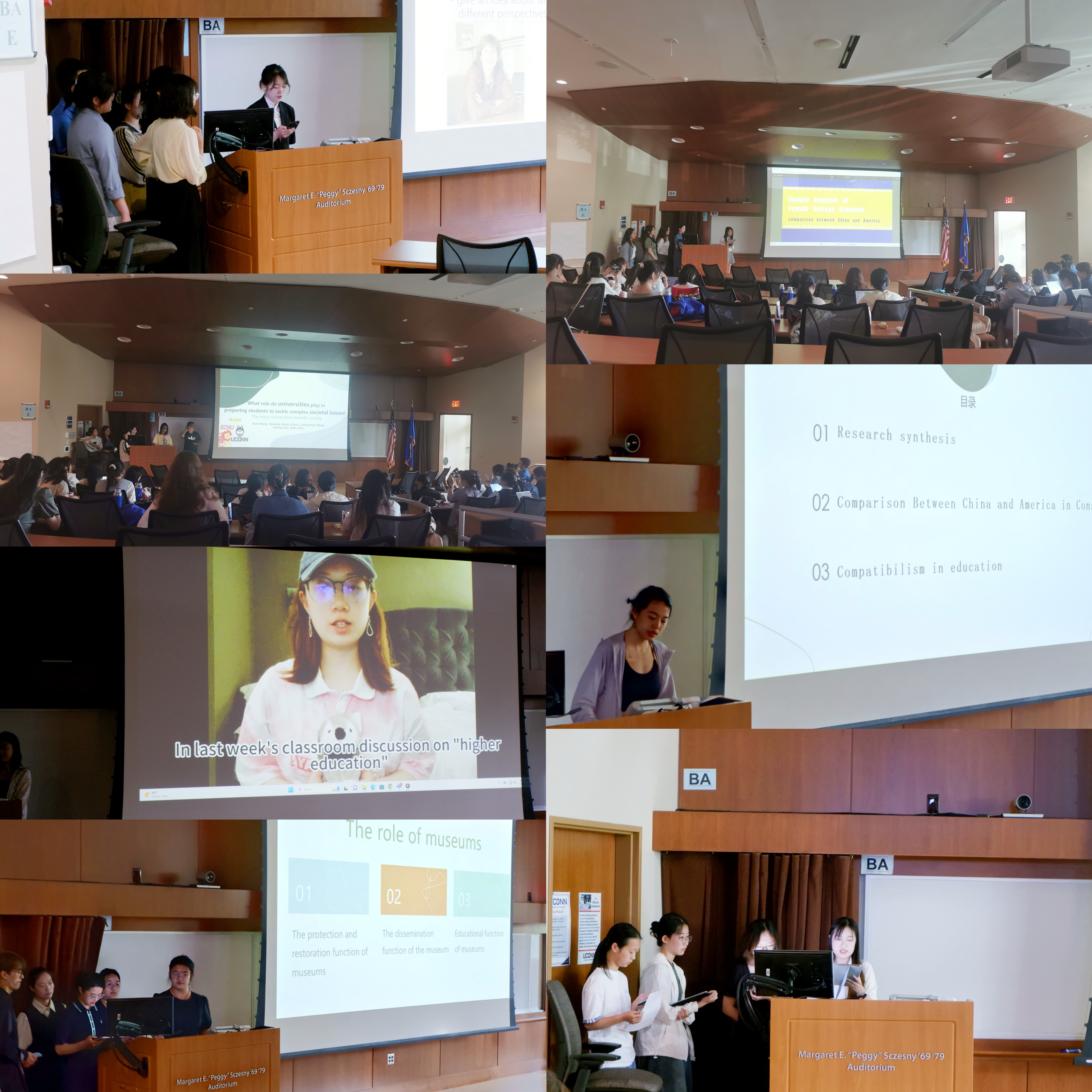 七组展示主题各异,包括:通过展示中美博物馆的异同,探究衍生产品在文化遗产宣传保护中的作用,剖析了文化遗产的全球性;介绍了哲学概念compatibilism在消费与教育中的体现,探讨了自由意志与决定论之间相容的可能性与可能途径;将某中国影视剧中所展现的女性形象、大学校园生活与美国校园文化有所比较,引入典型形象,引发共鸣与思考;比较中美大学在美育理论与实践方面的优缺点,认识到美育不仅是艺术教育,更是人的全面发展所必需的;以视频生动地比较了两校体育教育在课程设置、考核机制和团队文化的不同,增进了两校对体育教育多样性的认识;聚焦大学在社会事务参与方面的作用,强调大学校园文化与知识的传播对社会发展的整体性作用,为认识大学的社会责任和使命提供了新的视角;探究中美特殊教育学校的设置、理念选择和发展历史的差异,为促进教育公平和包容提供了宝贵的经验和建议。