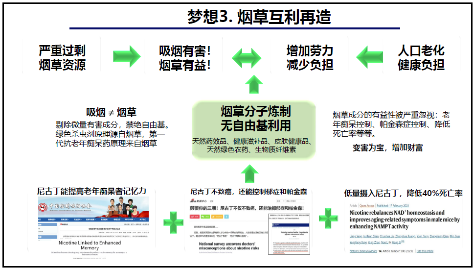 我国人口老龄化程度持续加深,疾病负担重,如果实现烟草分子的炼制重组和全面综合利用,摒弃自由基式的利用方式,就可实现有益的新型烟草日用品的再造,如天然药效品、健康滋补品、皮肤健康品、天然绿色农药、生物质纤维素等。