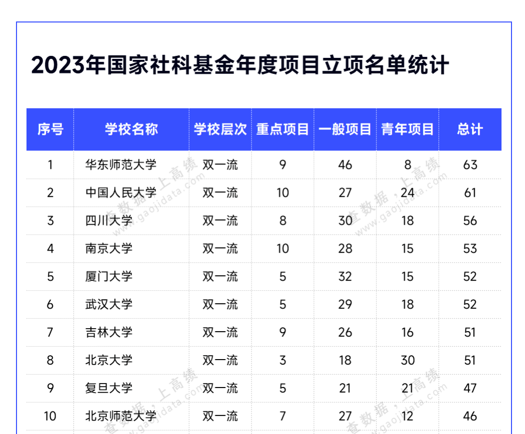 “高绩”2023年国家社科基金年度项目立项名单统计(前十)